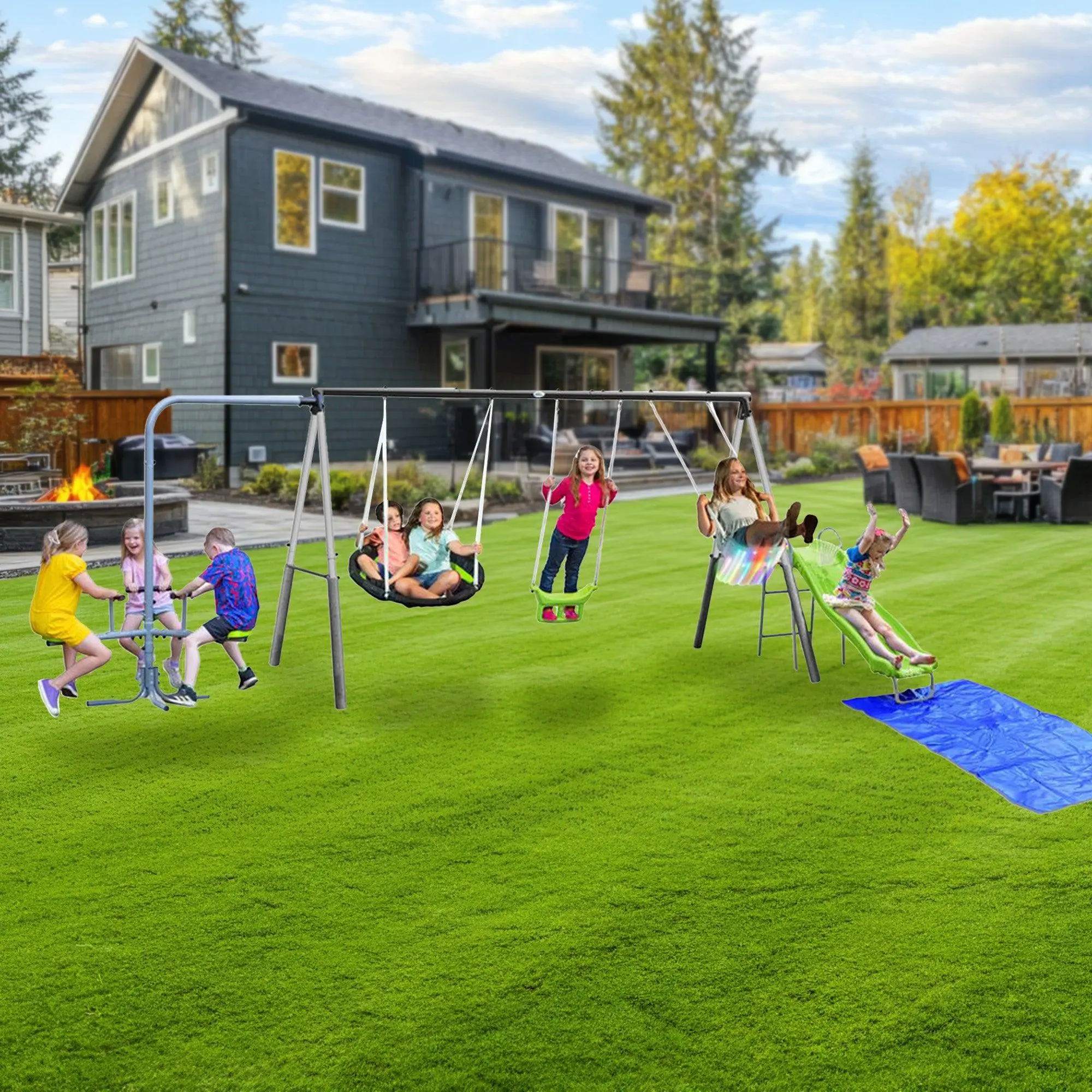 Features a 6ft wave slide with adjustable water sprinkler, 6’ ground tarp, and room for up to 8 kids (ages 3–8, max 100 lbs per child) for splashing, sliding, swinging, and spinning fun