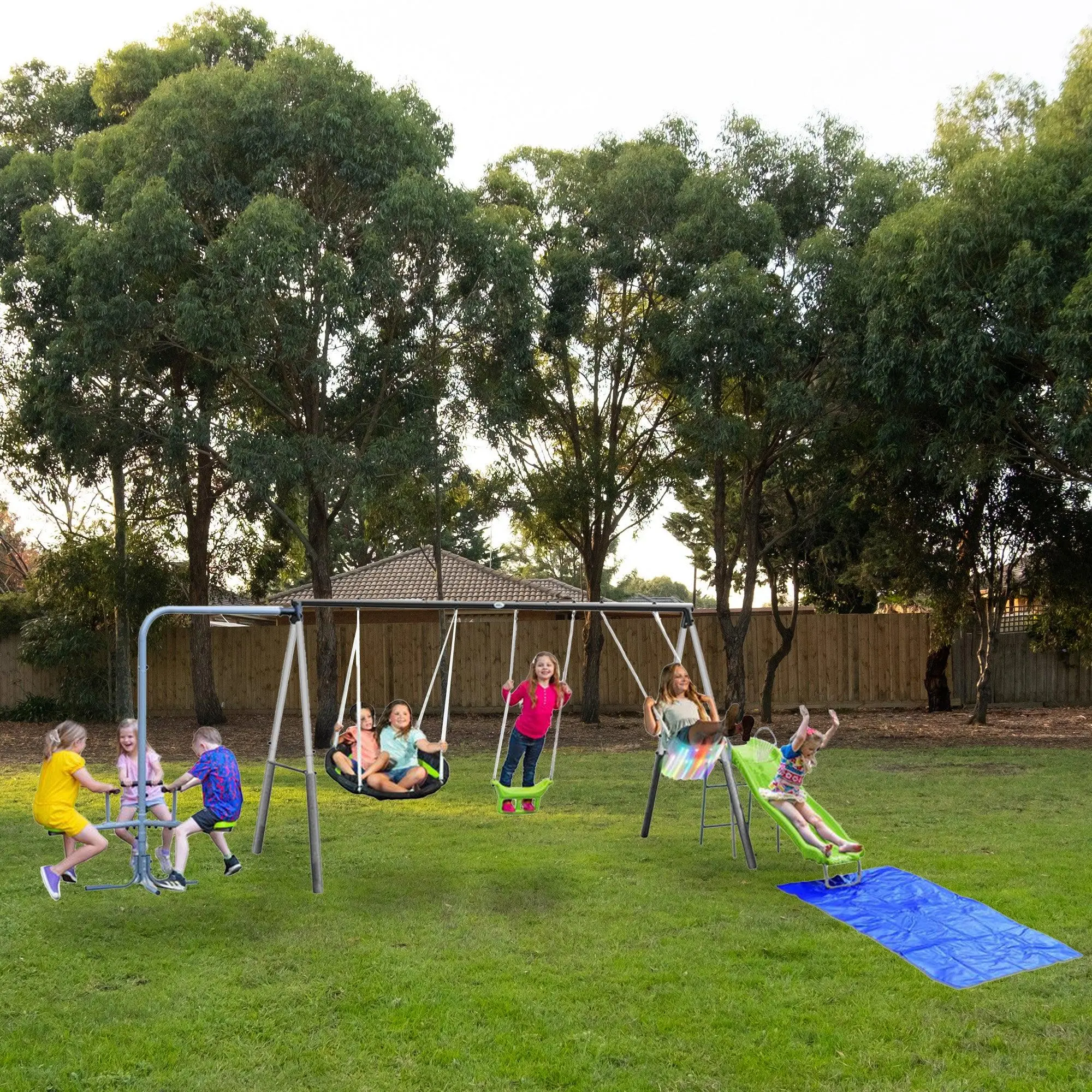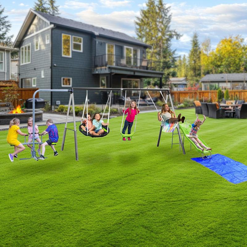 Turn your backyard into a splash-filled adventure with the XDP Recreation 6ft Water Wave Slide with Adjustable Sprinkler, a feature-packed outdoor playset designed for endless fun and excitement! With room for up to 8 kids to play safely at once, this all-in-one playground is perfect for children aged 3–8 years (maximum 100 lbs per child) and even fun for adults who want to join the splash zone.Crafted with a durable 4-leg painted welded steel tube frame, this set is built to last and provides maximum stability. The ASTM certified design ensures safety, while black foam leg pads and white chain covers offer added protection for worry-free play. Easy to assemble with the included manual, the full playset measures 218” wide x 91” high x 74” deep and weighs 106 lbs when fully assembled.The set features a 5’ blow-molded, 2-piece wave slide with a built-in adjustable water sprinkler and a 6’ ground tarp for exciting water play. Kids will love the SUPER DISC™ swing, which is large enough for two and includes a 34” black and green foam-covered disc frame for comfort and safety. The LED FIREFLY™ swing adds a magical glow for evening fun, while the classic non-slip Stand R swing and swing seat with chain covers provide a secure grip and smooth ride.To keep the energy going, the Triple Fun Go Round lets up to three kids spin together, encouraging cooperative play and movement. Grommets and two anchors are included for secure tarp placement, ensuring everything stays in place during active play.With bright, engaging colors and a variety of fun features, the XDP Recreation Water Wave Slide & Playground Playset brings excitement, exercise, and imagination right to your backyard—your kids’ favorite summer memories start here!