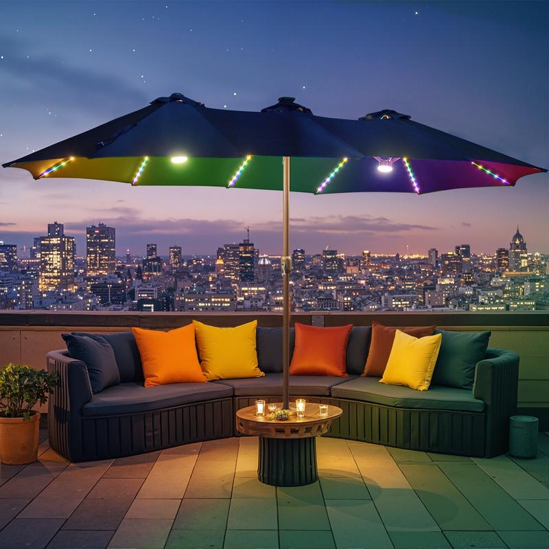 • LED Lighting: Equipped with LED lights on each rib, this umbrella offers illumination during the day and night. Solar-powered, it promotes energy efficiency. Enjoy a well-lit outdoor space with minimal power usage.