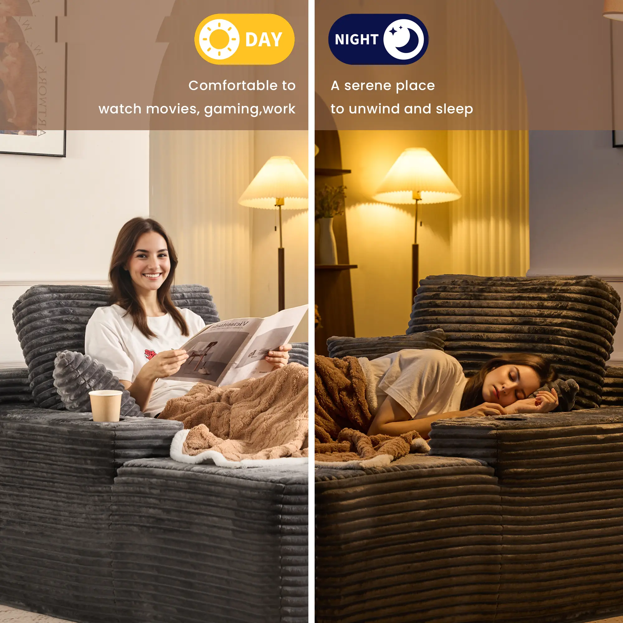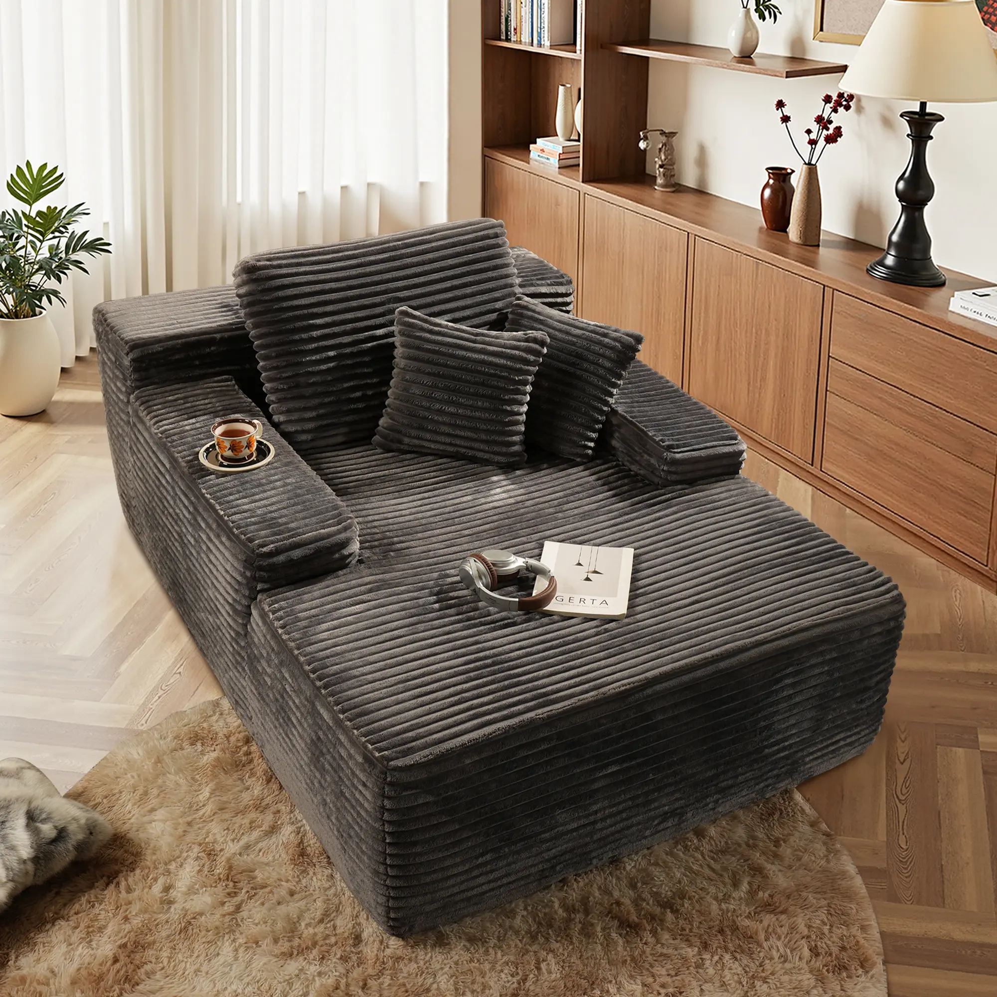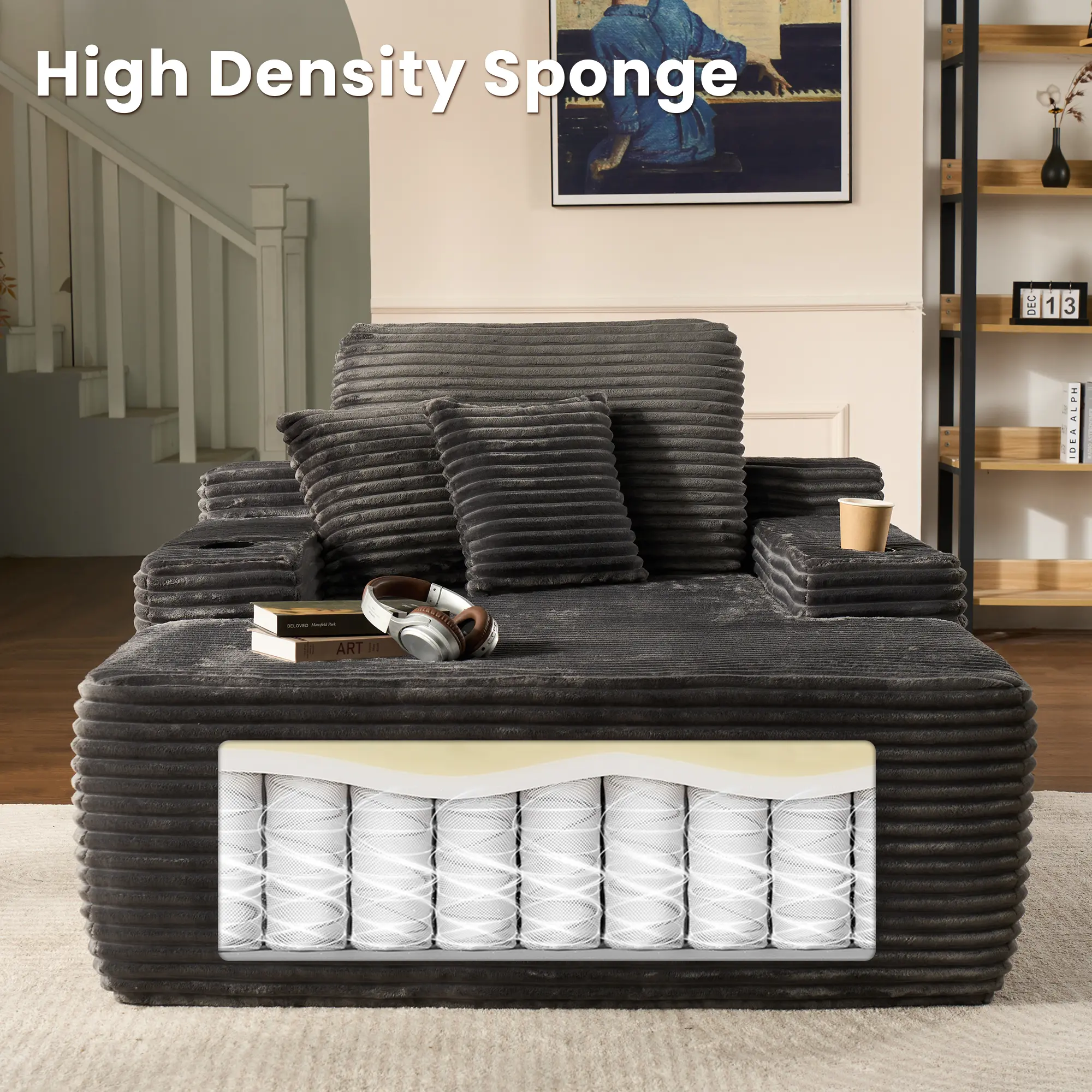 Deep Seat Chaise Lounge with Cup Holders: The spacious design offers plenty of room to stretch out—perfect for napping, reading, or watching movies.The oversized lounge chair with spacious sleeping area is enough to meet your and your family's needs.