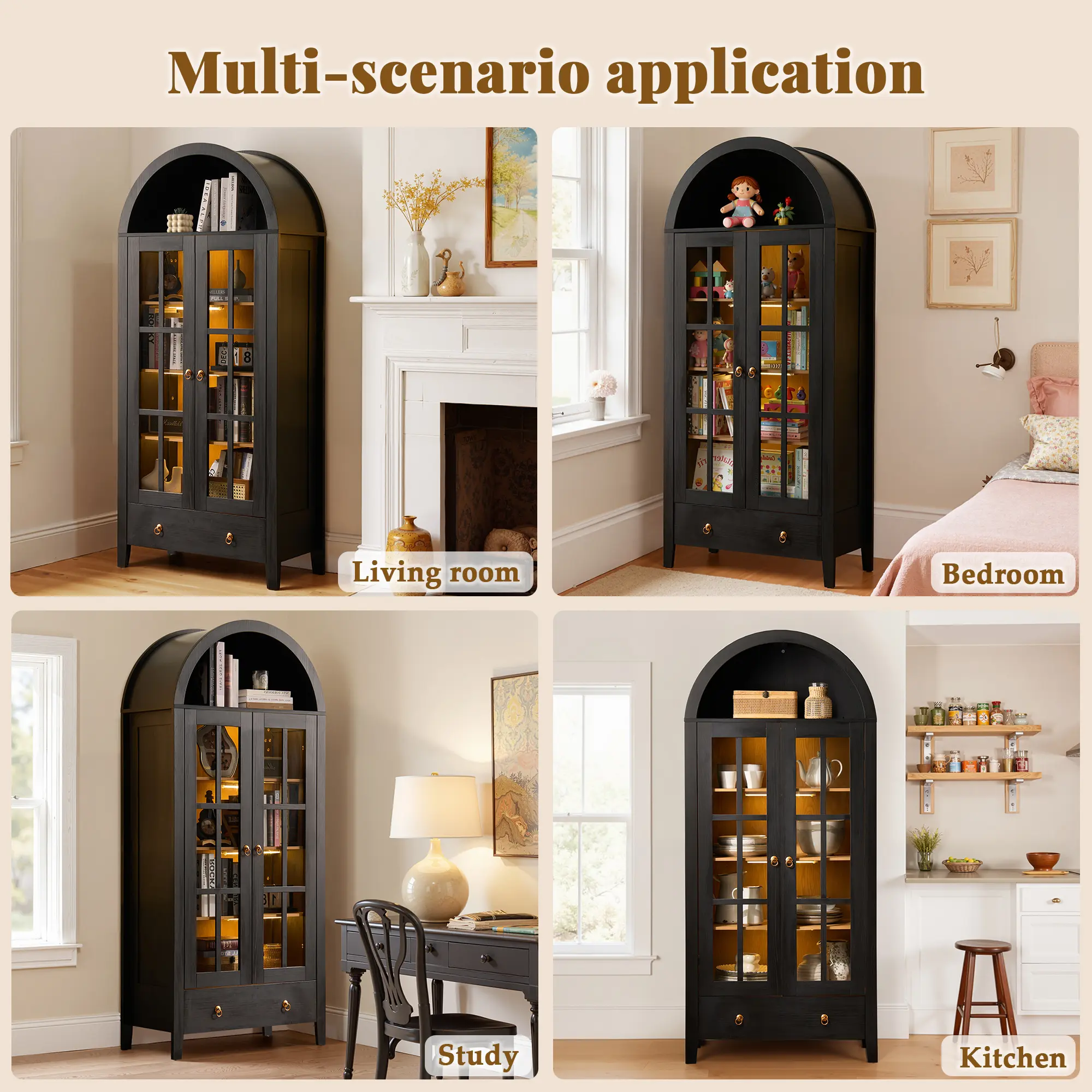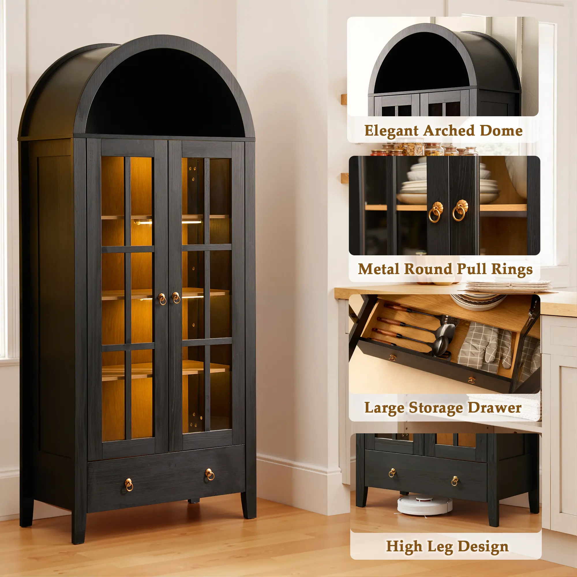 The XIZZI 71" Tall Arched Kitchen Pantry is a standout piece for any home. It boasts glass doors for easy viewing and rechargeable 3-color LED lights for adjustable illumination. The motion sensor ensures security and convenience. Perfect for kitchens, living rooms, and home offices, this pantry offers a 4-tier arched design for ample storage.