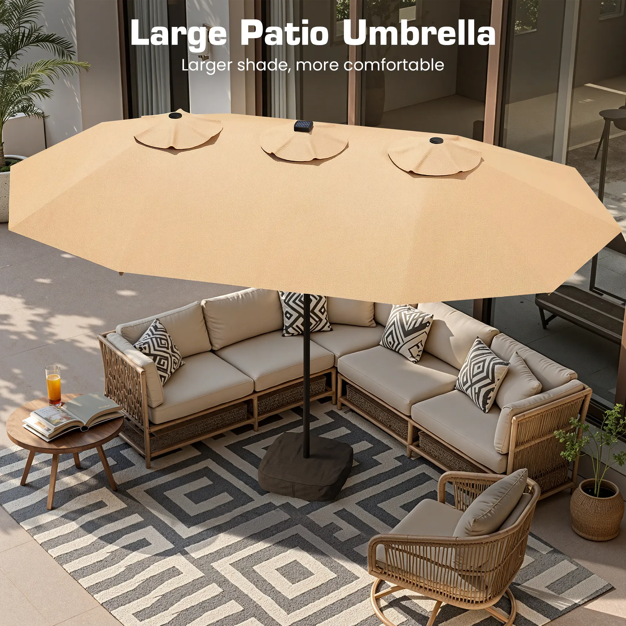 ·Extra Large Shade for Everyone: Enjoy the sun with our 15FT x 9FT large patio umbrella, offering a generous shading area of up to 135 square feet when fully open. This 15ft double-sided patio umbrella is perfect for gatherings with family and friends, making it an ideal choice for both home use and commercial locations