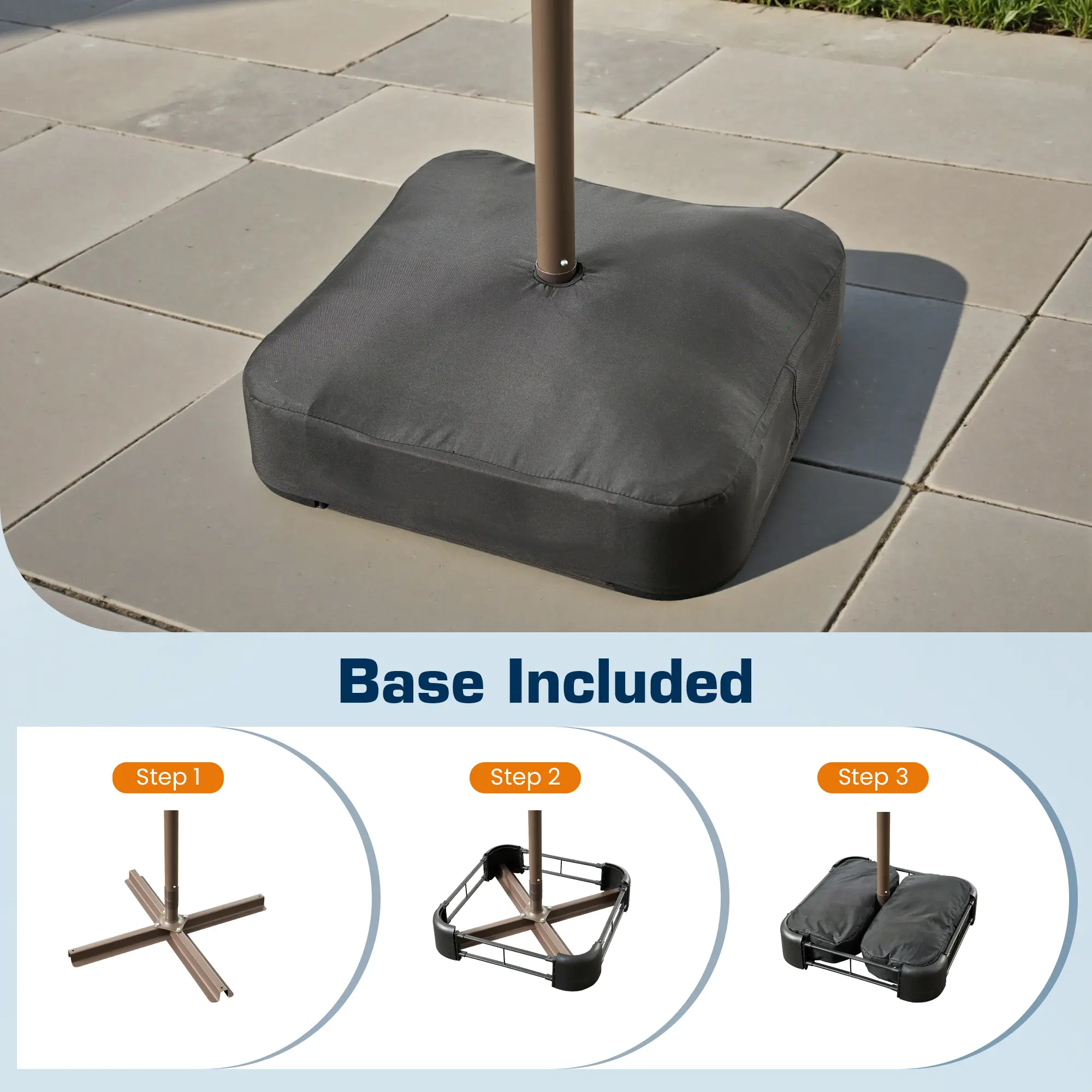 ·Stable Umbrella Base Included: Your purchase comes with a durable umbrella base, cross base, and two sandbags and a cover cloth. It’s important to weigh the base down while in use, ensuring stability (sand not included). Each sandbag needs to be filled with 100 to 180 lbs of sand for optimal support