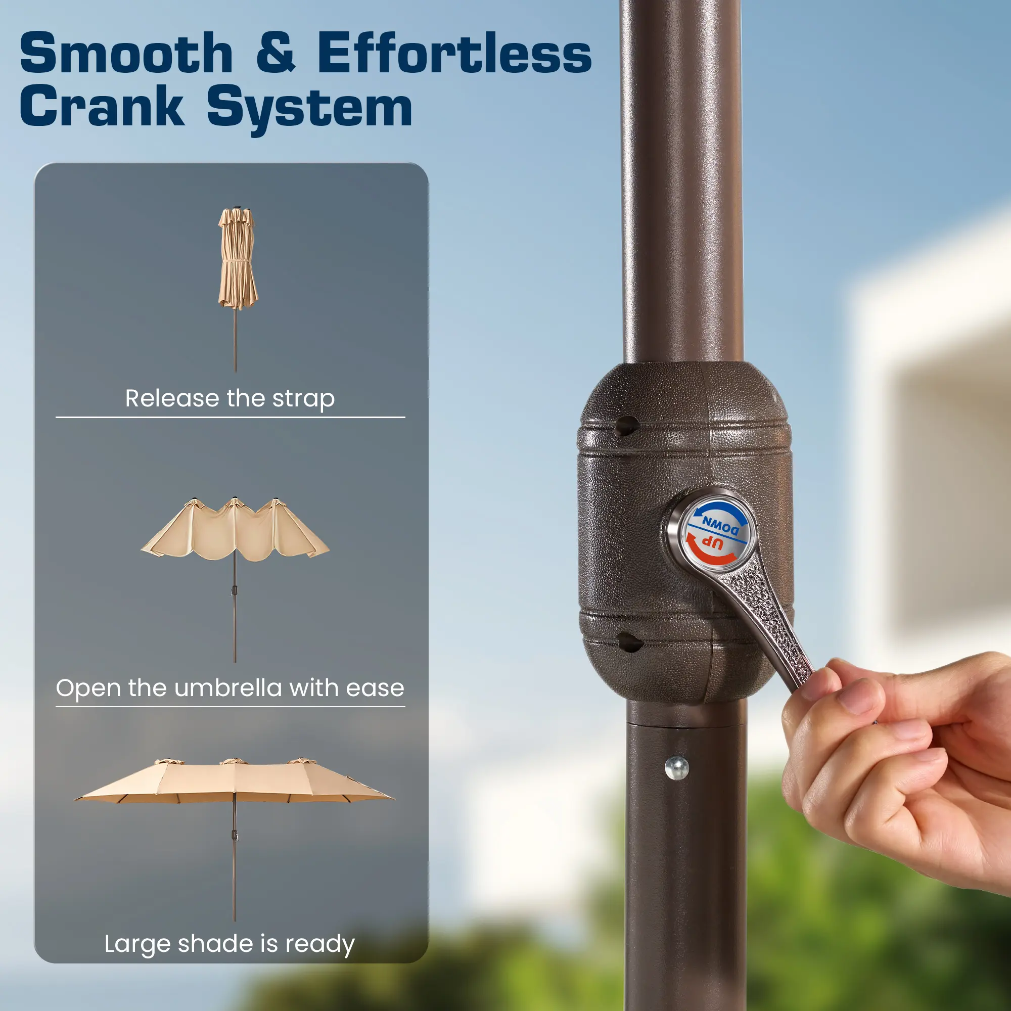 ·User-Friendly Design: Enjoy hassle-free outdoor shade with our easy crank lift system for smooth opening and closing. This 15ft patio umbrella with base complements any patio furniture set perfectly