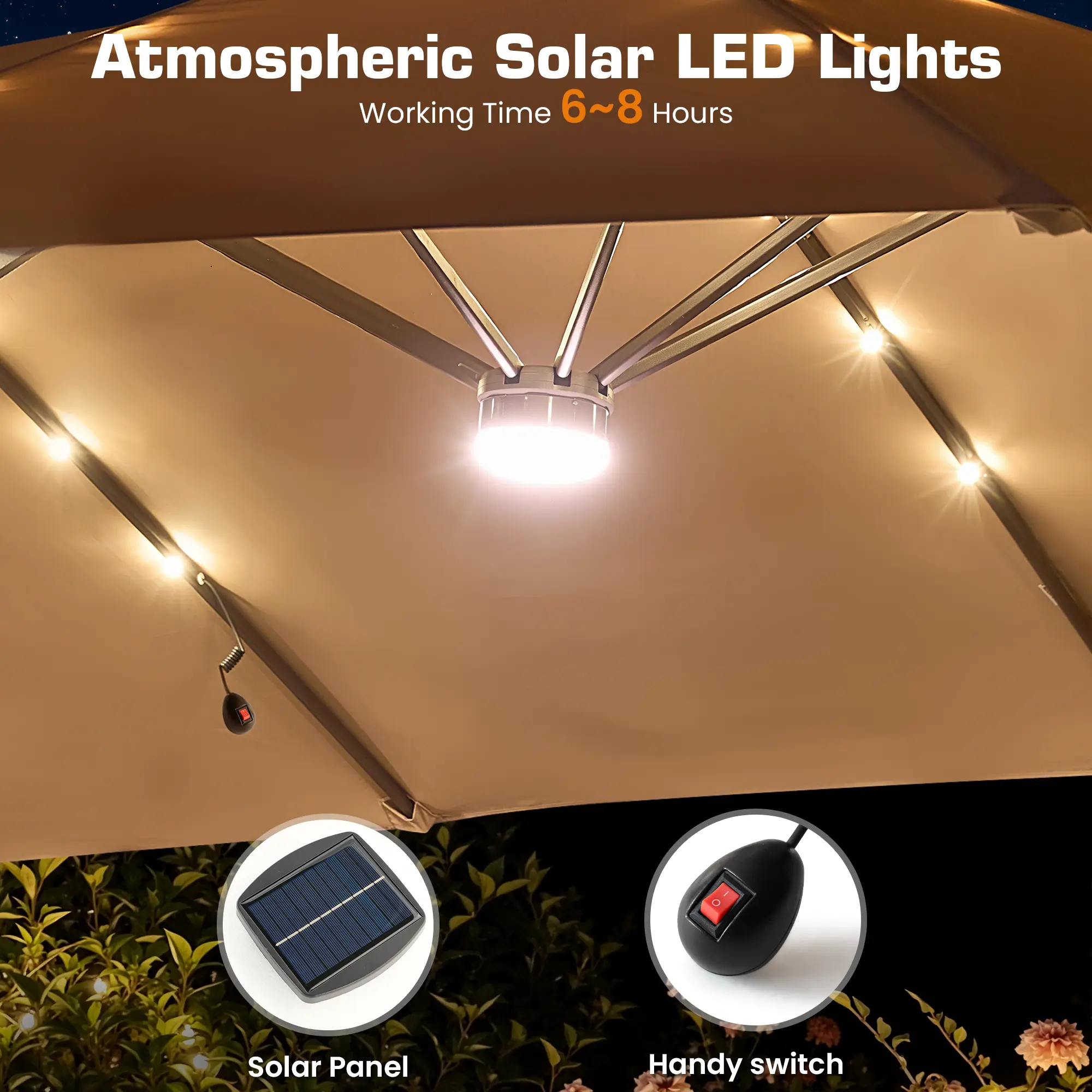 ·Dimensions & Care: Umbrella Size: 15(L) x 9(W) x 7.5(H) Feet, Base Size: 27.6"L x 27.6"W x 5.9"H. For longevity, please close and secure the umbrella when not in use, especially during windy or rainy conditions