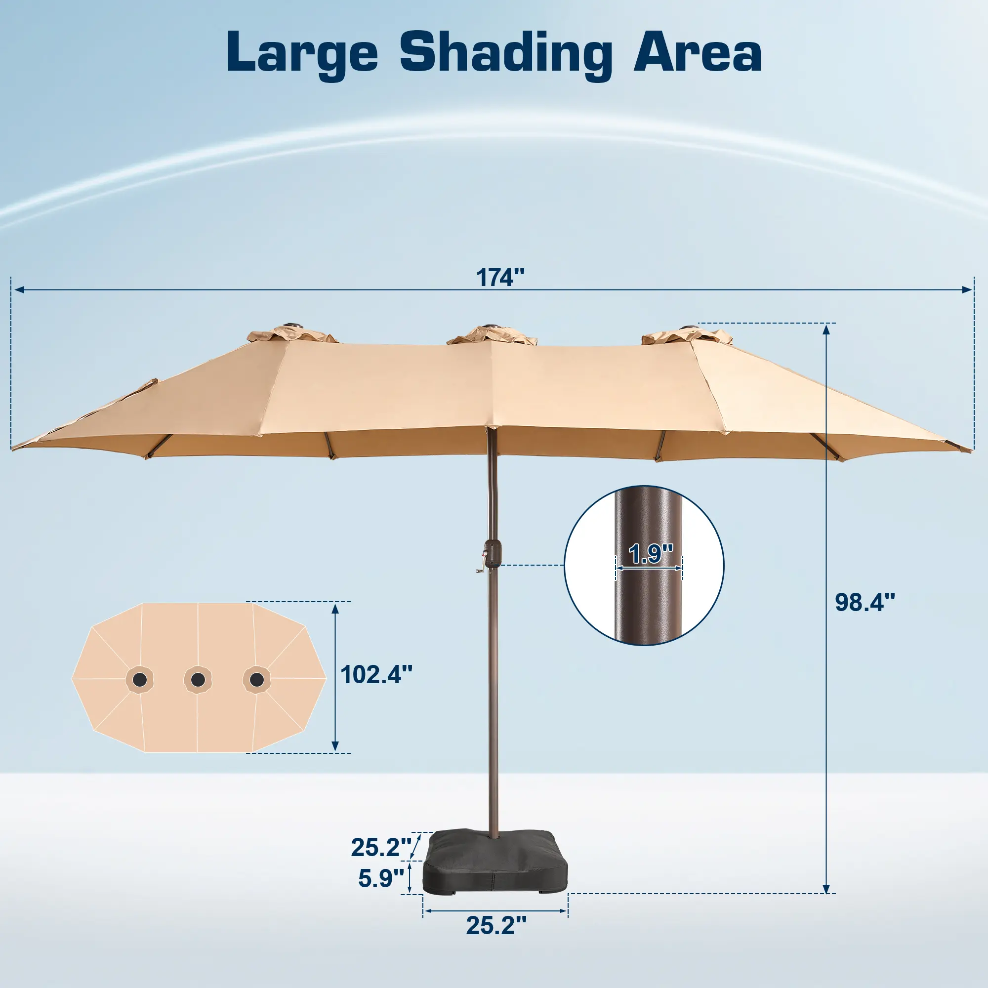 ·Important Measurements: The umbrella pole has a diameter of 1.9", and the base pole is 2.1". If you plan to use it with your own dining table, ensure the umbrella hole is larger than 1.9", and the fixed hole is larger than 2.1" for a proper fit