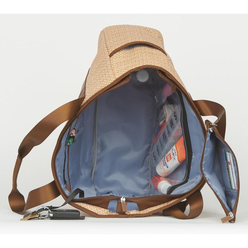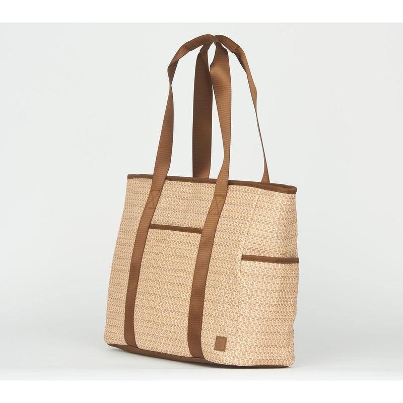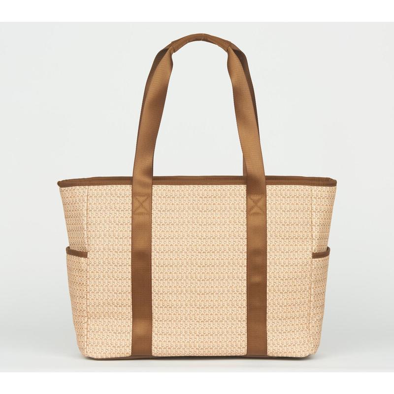 Shoulder straps with padded handles, zip top closure, 2 exterior_side pockets, interior key clip, Luxe fabrication, light color lining. Removeable wallet pouch with card slots. Front soft-lined cellphone & glasses pocket. Interior pockets, 2 pen holders, clear view pocket. Insulated water bottle pocket. Bag: 17 1/4"L, 5 3/4"W, 13 1/2"H. Wt: 1 lb. 8.0 oz.__Content: 70% polyurethane 30% polyester Outer; Lining: 100% recylced polyester. COO: IMPORT.