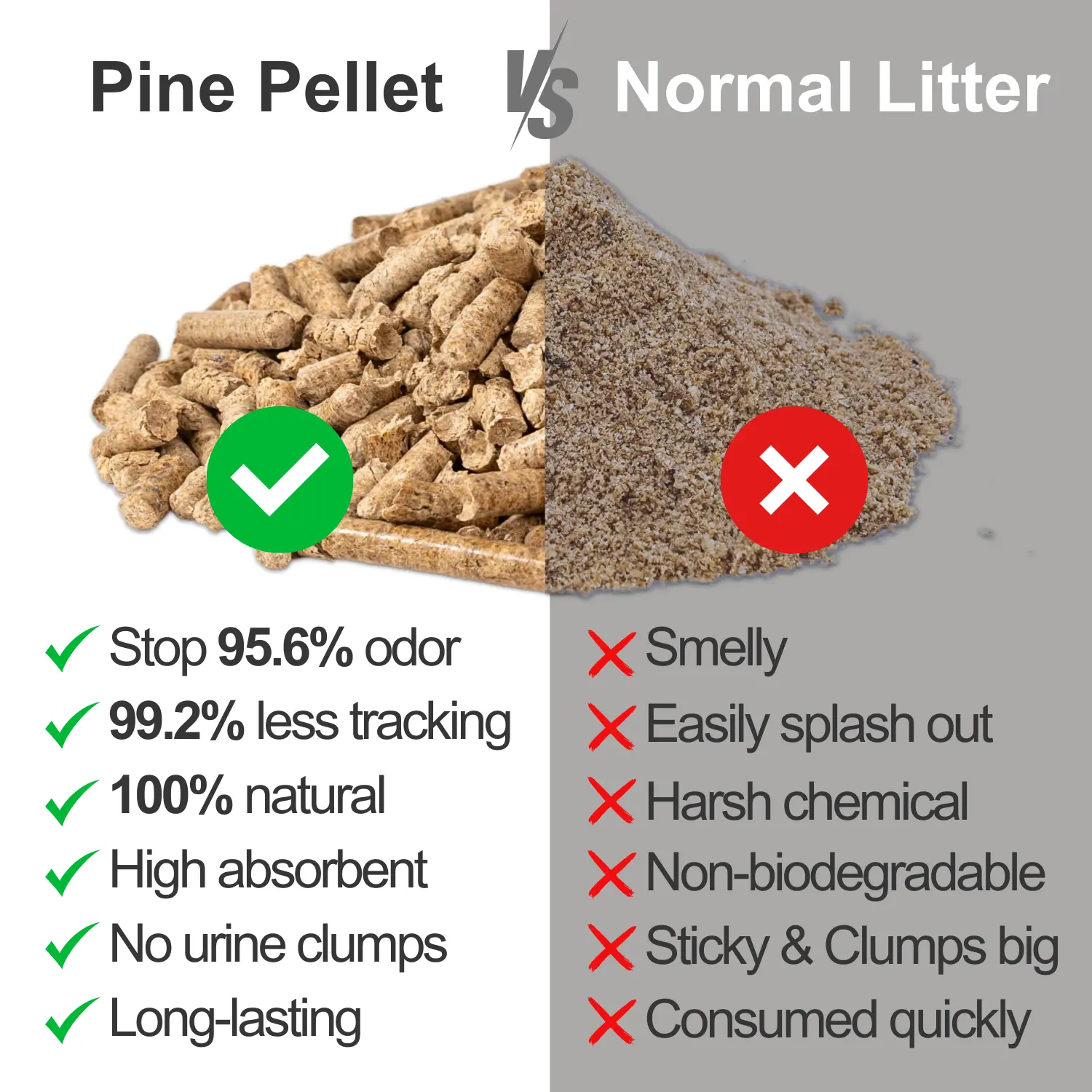 Pine cat litter significantly reduces odor by 95.6% and litter tracking by 99.2%. 100% natural, ensuring the health and happiness of both your pet and your family. When contacting with urine, the pellets soak up liquid and break down into sawdust quickly.