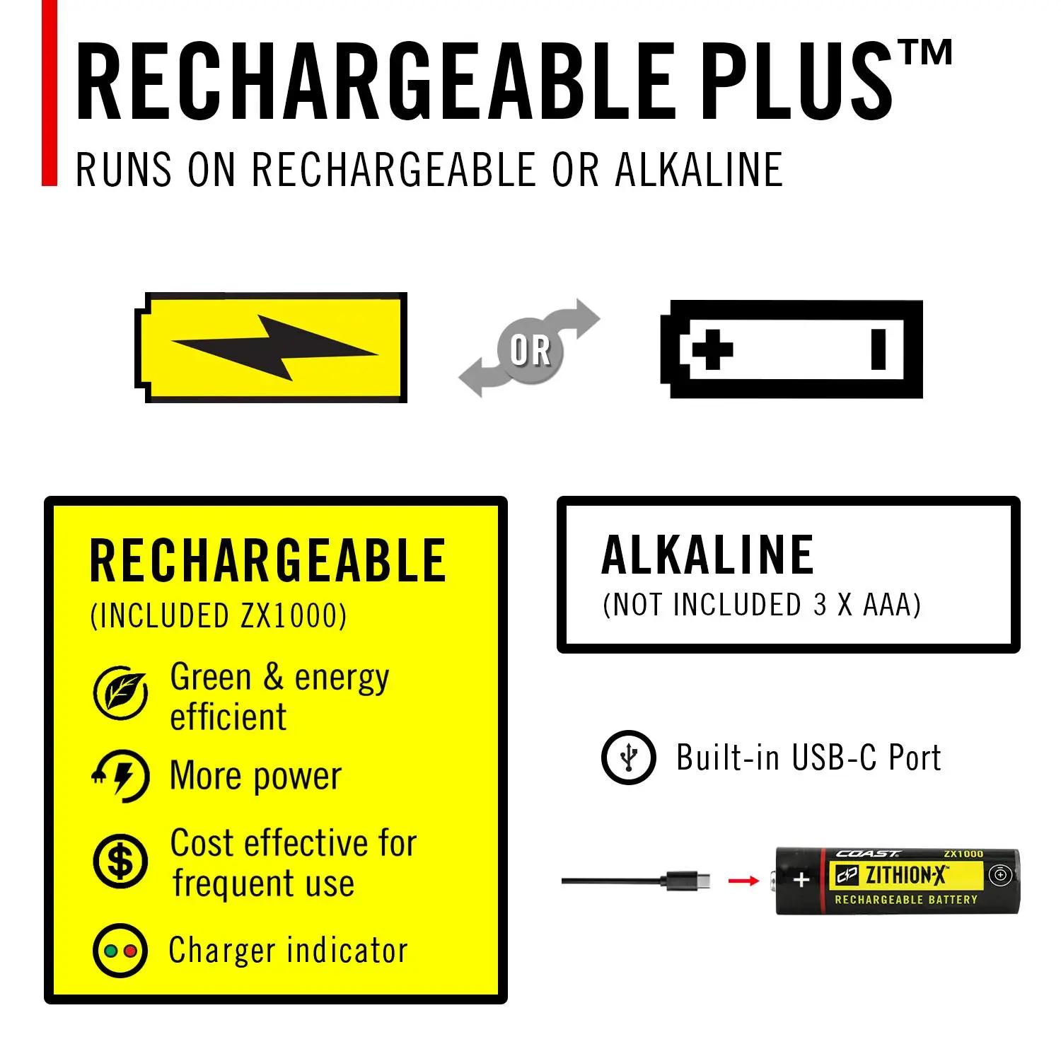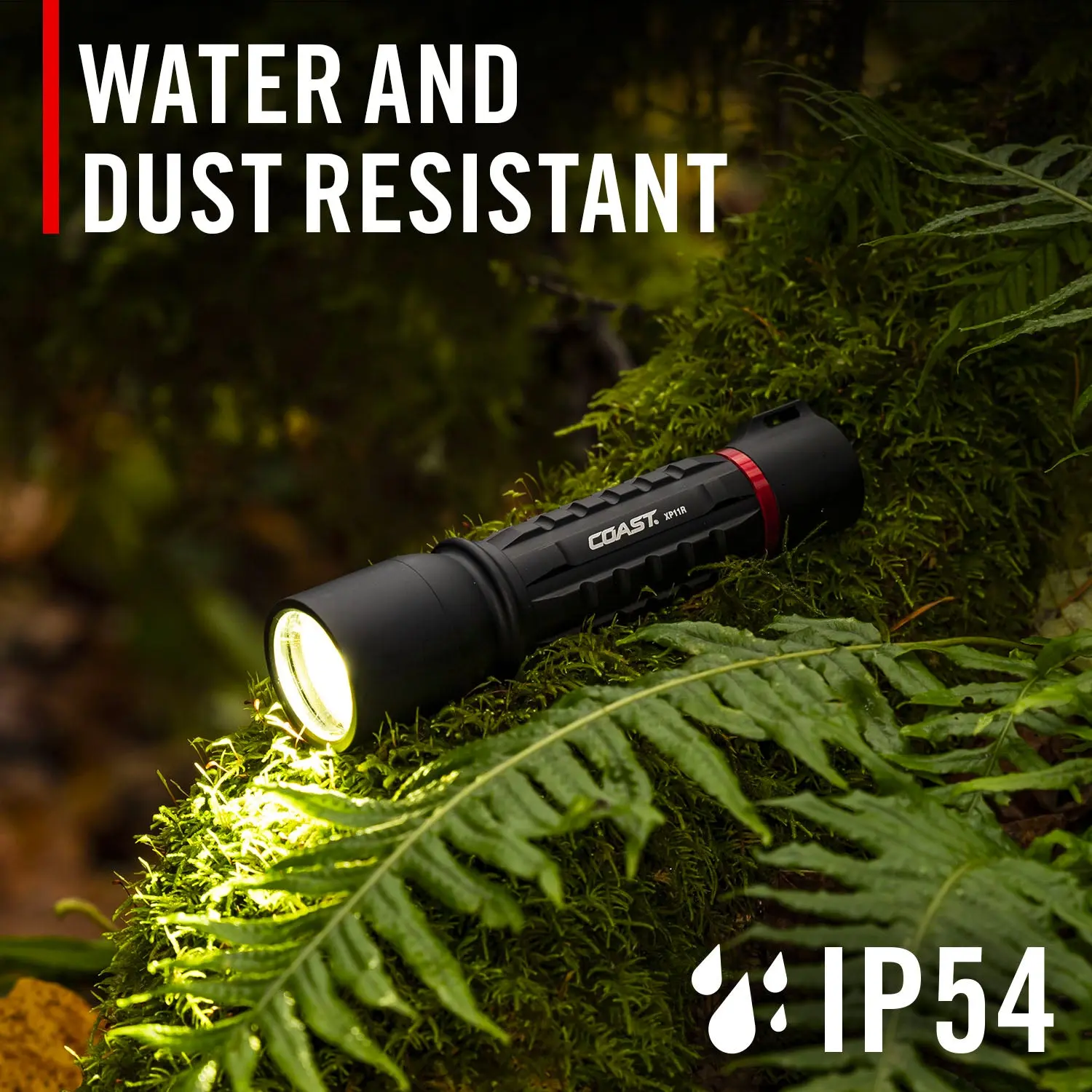 Cut through the deep darkness. The COAST XP11R showcases how power meets performance in our XP professional series, delivering ultra-bright light and four-mode, multi-beam capability at up to 3000 lumens on Turbo Mode—bold enough for midnight searches but weighing in at less than 6 ounces. Featuring COAST Rechargeable Dual Power technology, this IP54 dust-resistant and storm-proof flashlight is powered by a COAST ZITHION-X™ rechargeable battery (charging cable included) but can also run on standard alkaline AAA (purchased separately)—with a real-time power indicator so that you always know when to power up. COAST-patented SLIDE FOCUS® optical technology shines the Ultra View Flood Beam and BULLS-EYE™ Spot Beam with seamless transitions up to 280 meters.