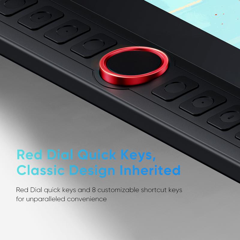 Easy & efficiency Red Dial Quick Key simplifies the interface for beginners, like aspiring graphic designers and junior illustrators, allowing them to master essential controls such as brush size, navigation and zoom In/Out. This design ensures a natural hand position, reducing wrist strain during prolonged use. Additionally, with 8 customizable keys, users can easily assign frequently used functions, streamlining their workflow and minimizing interruptions