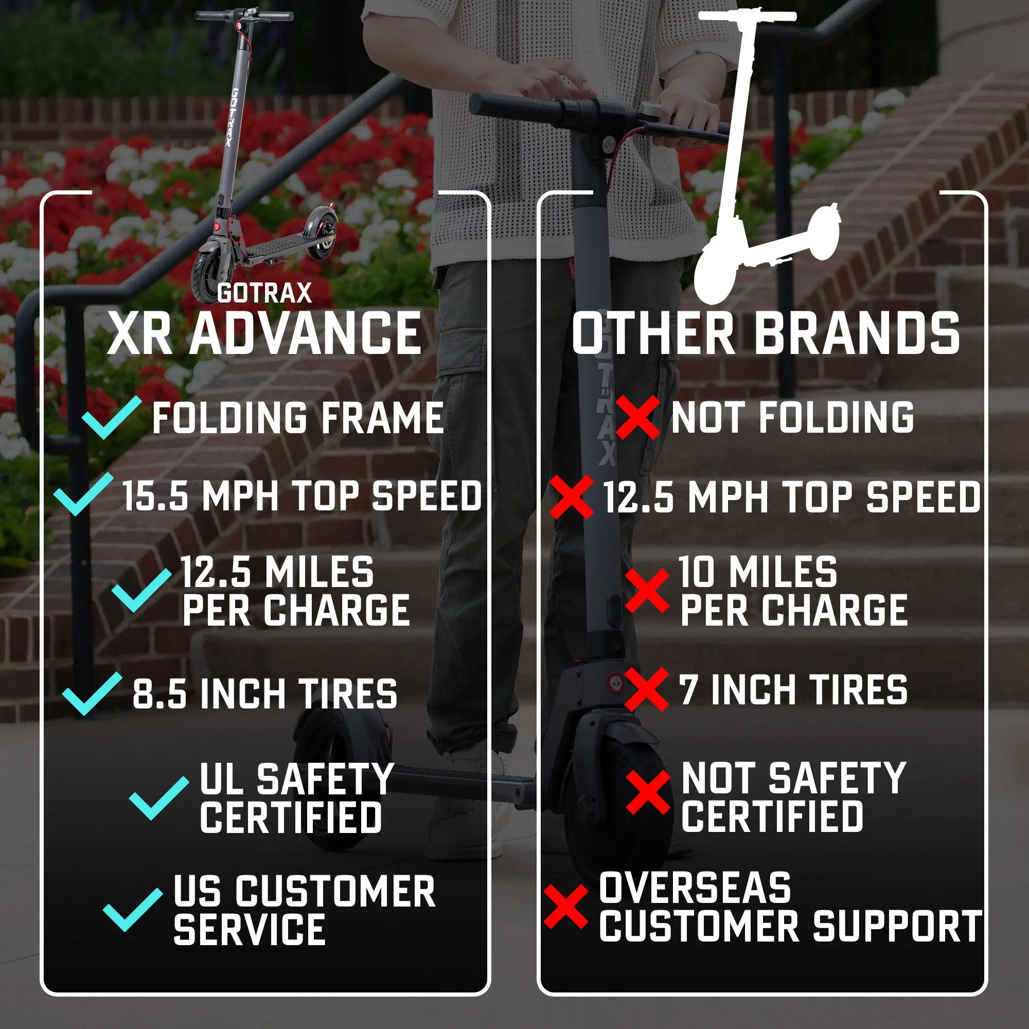 The XR Advance is the perfect scooter for entry-level riders. Featuring a lightweight folding frame, 15.5 MPH top speeds, and shock-absorbing tires, this electric scooter is sure to make every ride convenient and enjoyable.