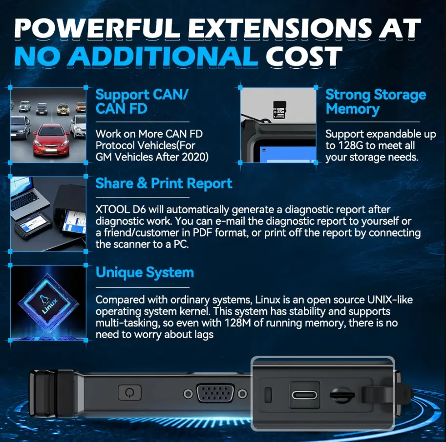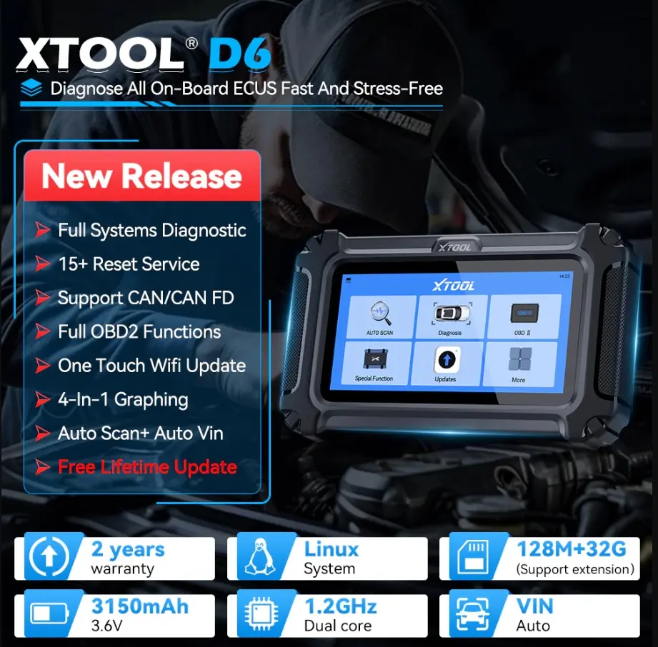 XTOOL D6 OBD2 Scanner is ideal for both DIYers and small shops. It provides fast, accurate diagnostics for 90+ vehicle brands, covering all systems scan: Engine, ABS, Transmission, Airbag, Fuel, HVAC, TPMS and more. Get clear insights to prevent costly repairs & keep your vehicle running at its best