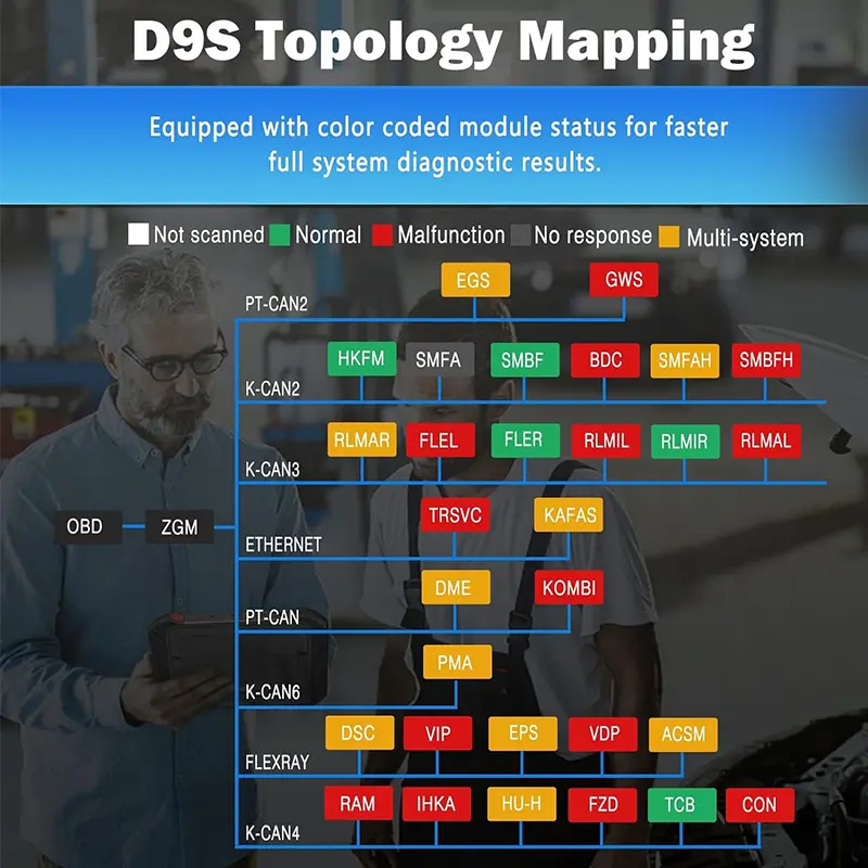 • OE-Level Full System Diagnostic with Topplogy Module Mapping: With Topplogy Map for faster full system diagnostic to view the communication structure between modules clearly with all the situation of each system tp read/clear codes, live data PIDs graphing for all vehicle systems including Engine, Transmission, Chassis and Safety control system, Body control system, Communication and Entertainment system, etc.
