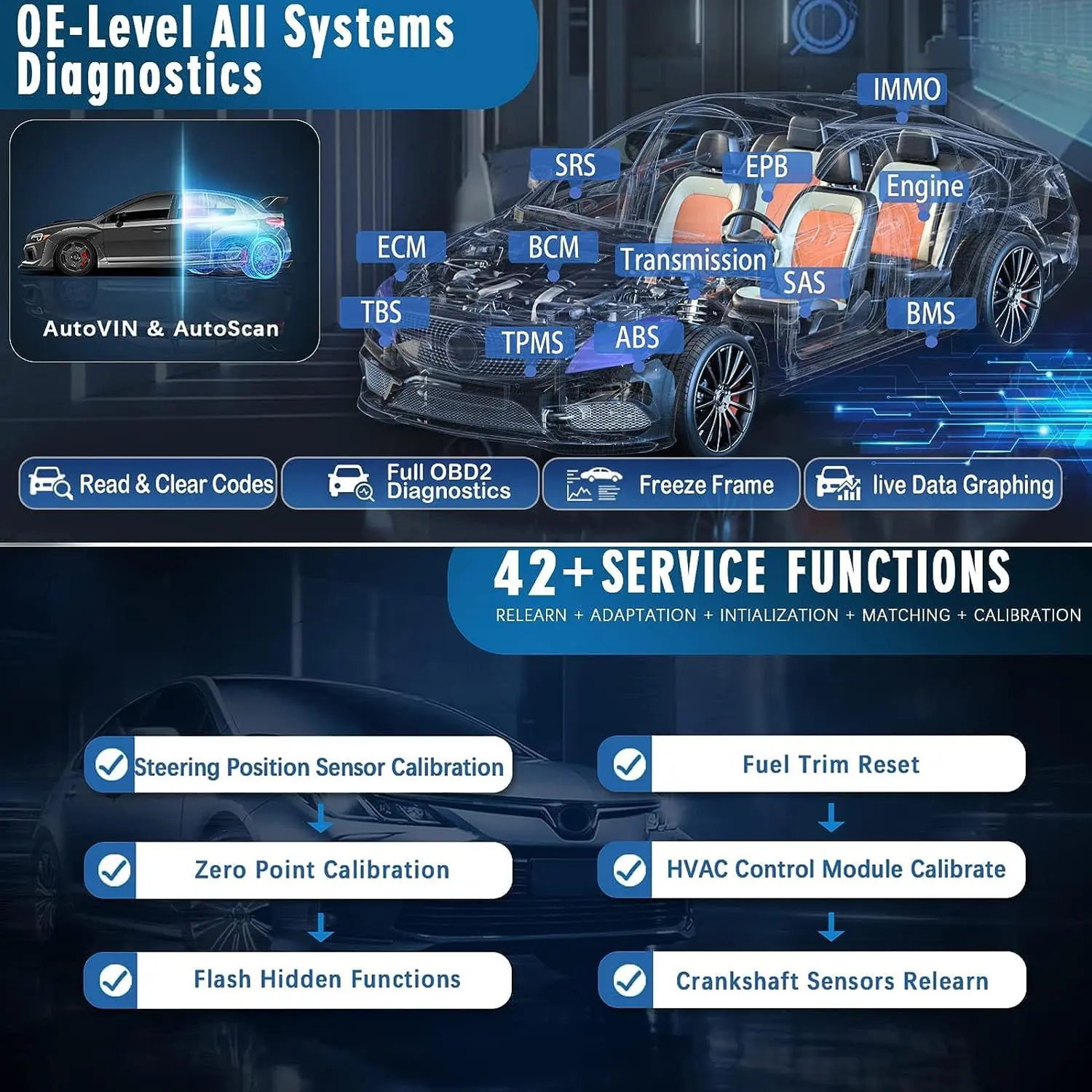 • 42+ Maintenance Services & Full Special Functions: Oil Reset, EPB, BMS, SAS, DPF, Throttle Relearn, ABS Bleed, injector Coding, Air Suspension, Transmission Relearn, TPMS Reset, Airbag Repair, Hybrid Control Compression Test, HVAC Control Module Calibrate, Zero Point Calibration, Injector Balance Test, Fuel Trim Reset, Cylinder Power Balance, Crankshaft Sensors Relearn, rewrite the vin on pcm, alcohol composition reset, suspension calibration, etc.