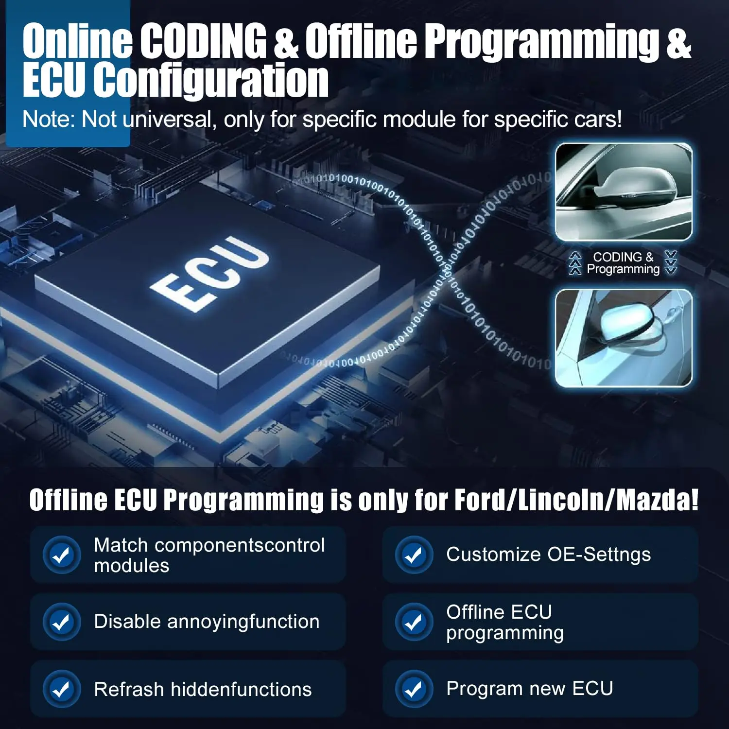 Flash Hidden Functions(ECU Configuration) for BMW/for VW/for AUDI/for SKODA/for TOYOTA/for LEXUS/for SCION/for MAZDA/for FORD/for LINCOLN, help refresh hidden functions to reprogram adaptive data for certain components after making repairs or replacements. You can activate the higher-level car functions and disable any annoying features. Customize some extra options such as disabled the seat belt buzzer, wind the windows down with the remote fob.