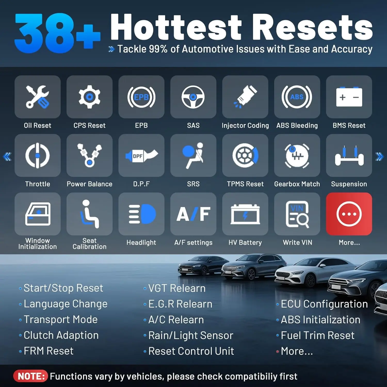 38+ Special Functions for Daily Maintenance:Handle routine and advanced services with over 38 maintenance functions, including Oil Reset, ABS Bleeding, Injector Coding, Crankshaft Position Relearn, Battery Matching, and SAS Calibration. Ideal for technicians and advanced DIYers looking to complete post-repair calibration and system resets quickly. Functions vary by model—send VIN for compatibility check.