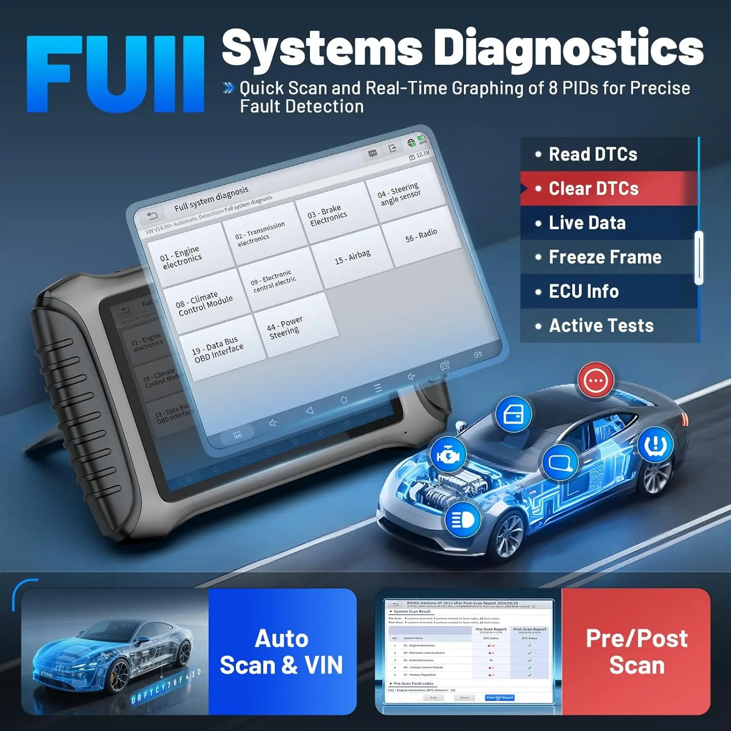 Auto Scan, Pre/Post Scan & Smart Reporting:Simplify workflow with Auto Scan and Pre & Post Scan features for comprehensive vehicle checks. Generate Diagnostic Reports V2.0, which are easy to share and store for future reference—ideal for customer transparency and shop documentation. These reports make it easier to track repair history and maintain professional standards.