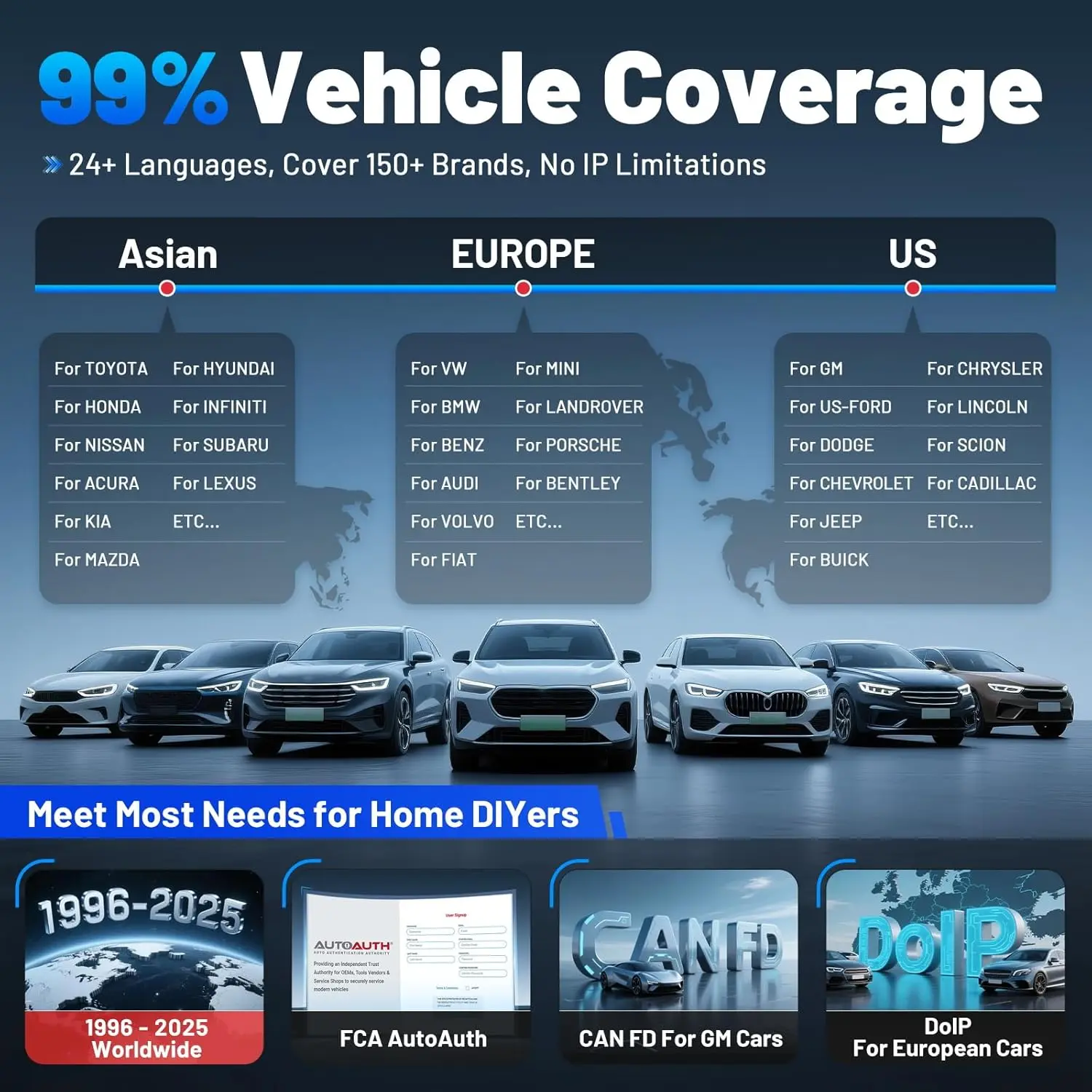 Next-Gen Protocols & Global Coverage:Stay ahead with support for FCA AutoAuth (2018+ for Chrysler/for Dodge/for Jeep/for Fiat), CAN FD (for GM 2020+), and DoIP (for BMW/for Jaguar/for Land Rover). These protocols enable faster communication and access to more control modules, ensuring compatibility with modern vehicles. Works on 10,000+ car models worldwide without IP restrictions.