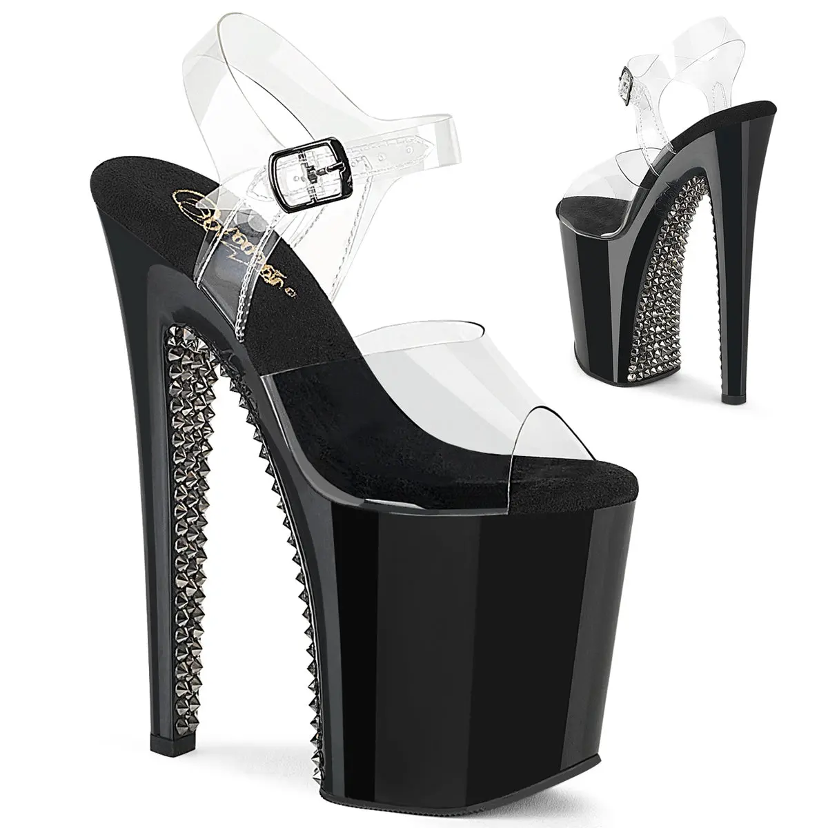 Step into the spotlight with the Xtreme-808SPRS sandals, where bold design meets daring style. Featuring an 8-inch heel and a 4-inch platform, these ankle strap sandals are crafted to turn heads. The clear/gray colorway adds a futuristic edge, while the spiked rhinestones on the platform underside and front of the heel deliver a touch of rebellious glamour. Perfect for those who want to make a statement, the Xtreme-808SPRS combines striking aesthetics with a confident silhouette. Whether you're commanding the stage or the night, these sandals are your ultimate style companion.