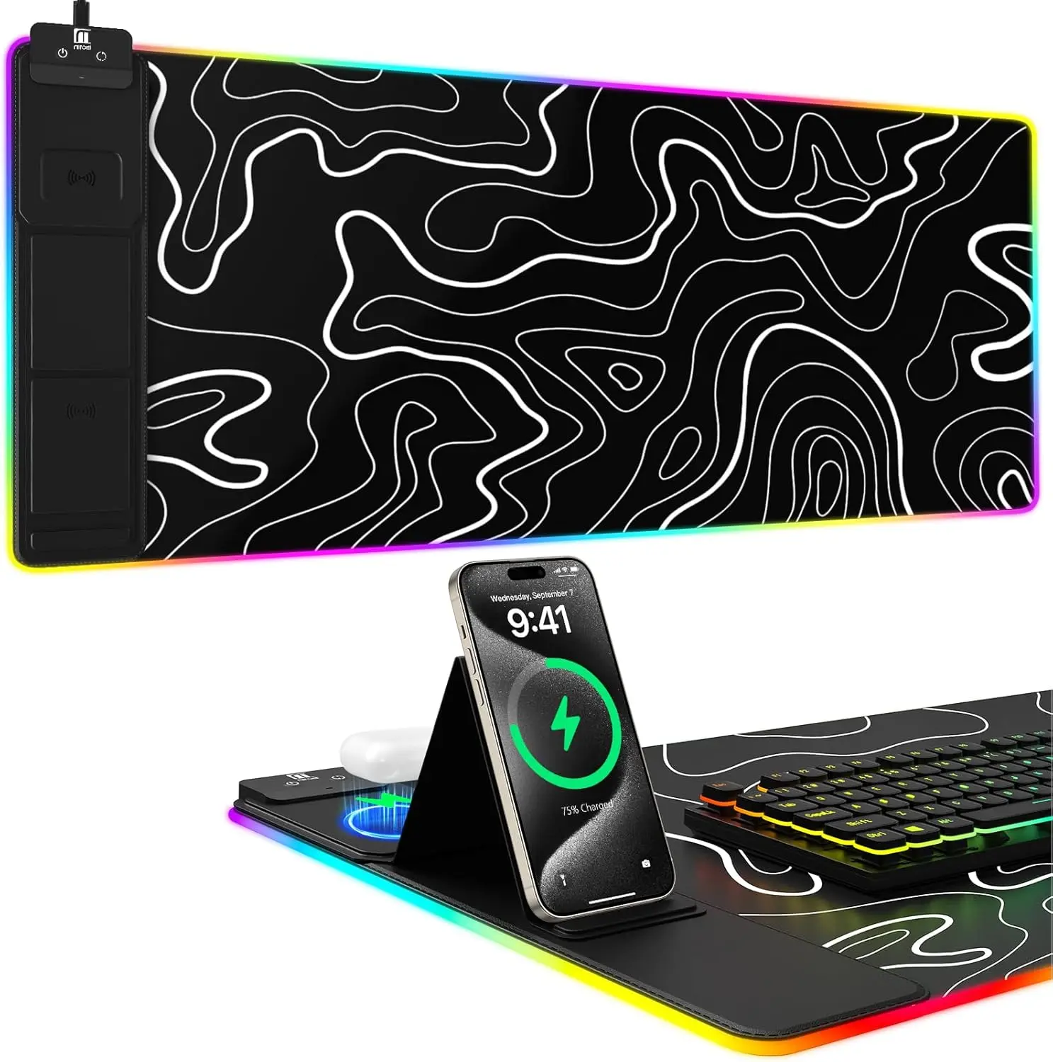 ·RGB Mousepad with Phone Holder : Light up mousepad can be switch 11 lighting modes, including 11 static lighting modes and 2 dynamic effects. Create a distinctive atmosphere while playing games or working with a rgb mouse pad. The power-off memory function can remember your last light mode choice. One button controls all light modes, press once to switch light color, long press to switch light modes. The wireless charging function and RGB lighting can work separately.