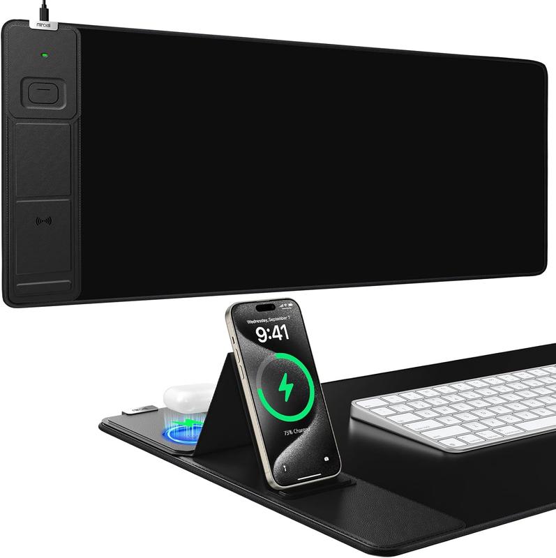 ✨ Mouse Pad with Phone Holder: This mousepad includes a built-in 15W fast wireless charging function. Compatible with iPhone and Samsung Galaxy series, Airpods Qi-enabled devices. Note: 15W charging requires a 18W/20W adapter, not included.