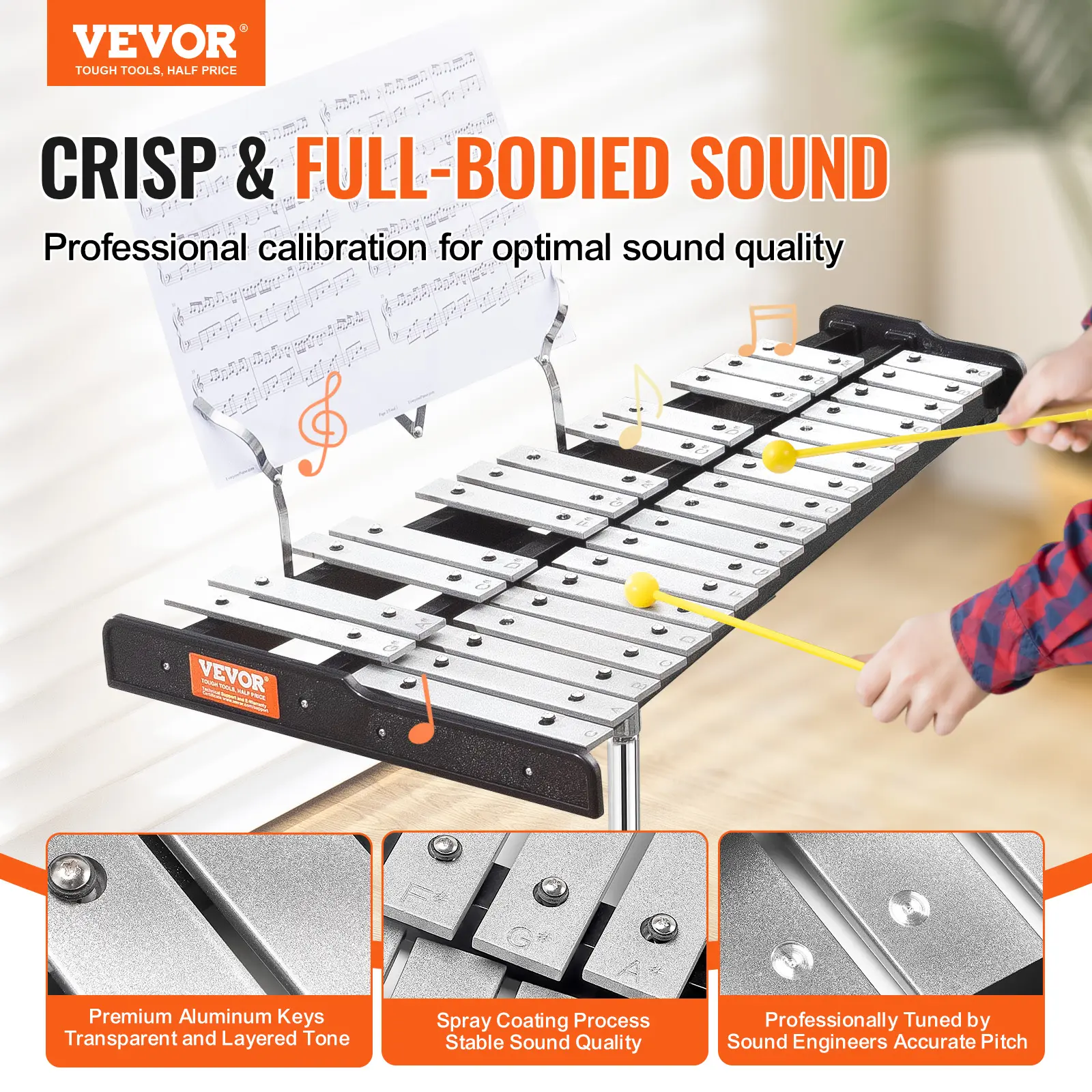 • Professional 30 Note Xylophone: The professional 30 note xylophone boasts a range from G5 to C8, comprising 30 distinct notes organized into two rows: one for semitones and the other for whole tones. Crafted with precision using advanced spray painting techniques, it delivers crisp and rich tones. Each aluminum bar undergoes professional tuning, with clear note markings for easy identification.