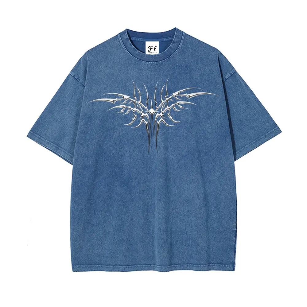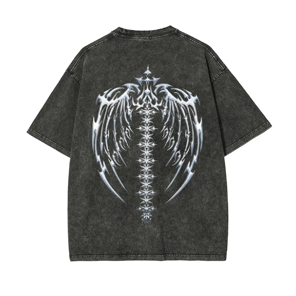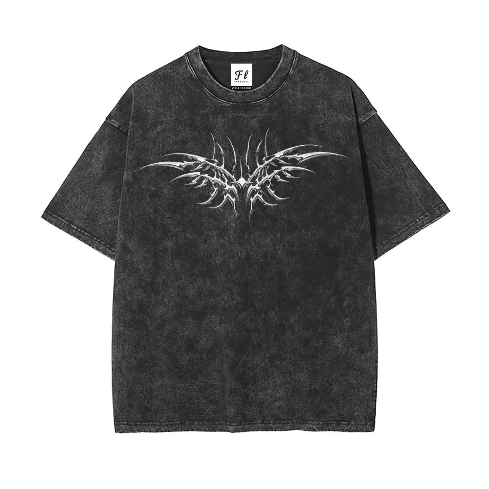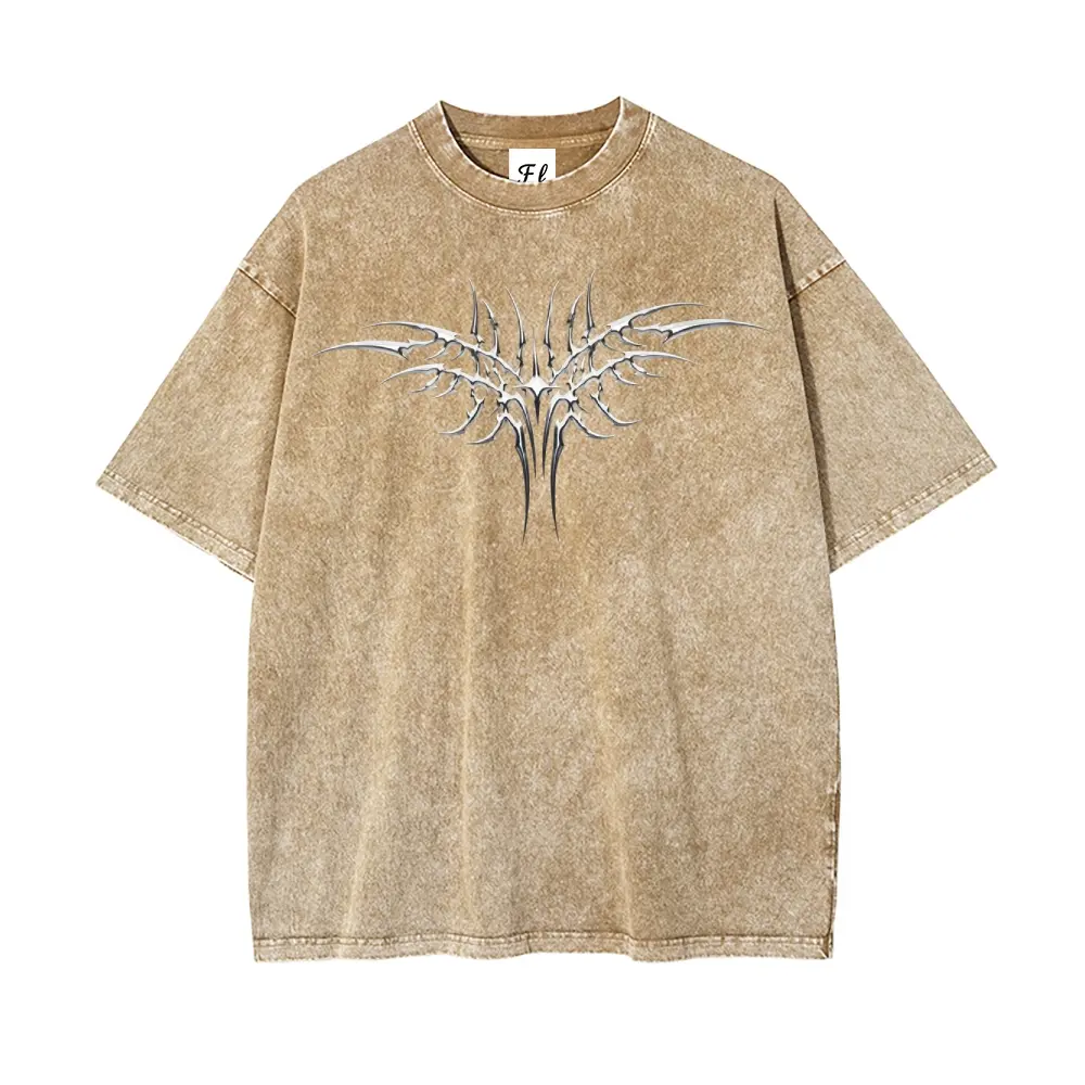 [Printed Design – Not Textured]Y2K Cyber Sigilism Graphic T-Shirt Acid Wash Vintage Grey Cotton Tee Oversized Tribal Chrome Design Gothic Grunge Style Streetwear Heavyweight Top For Me