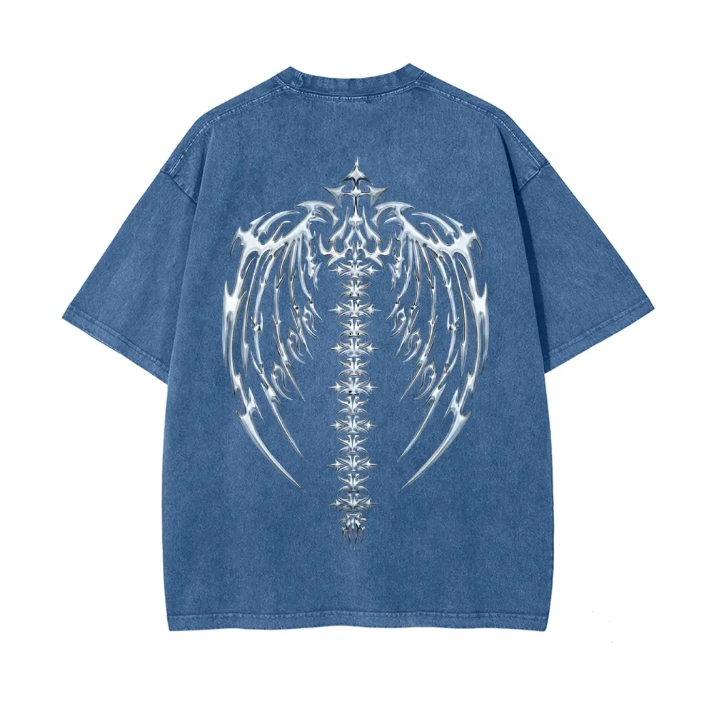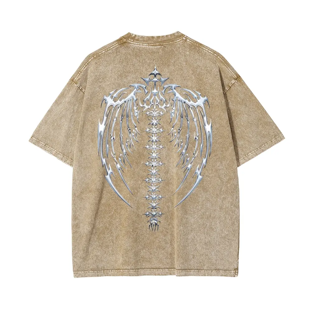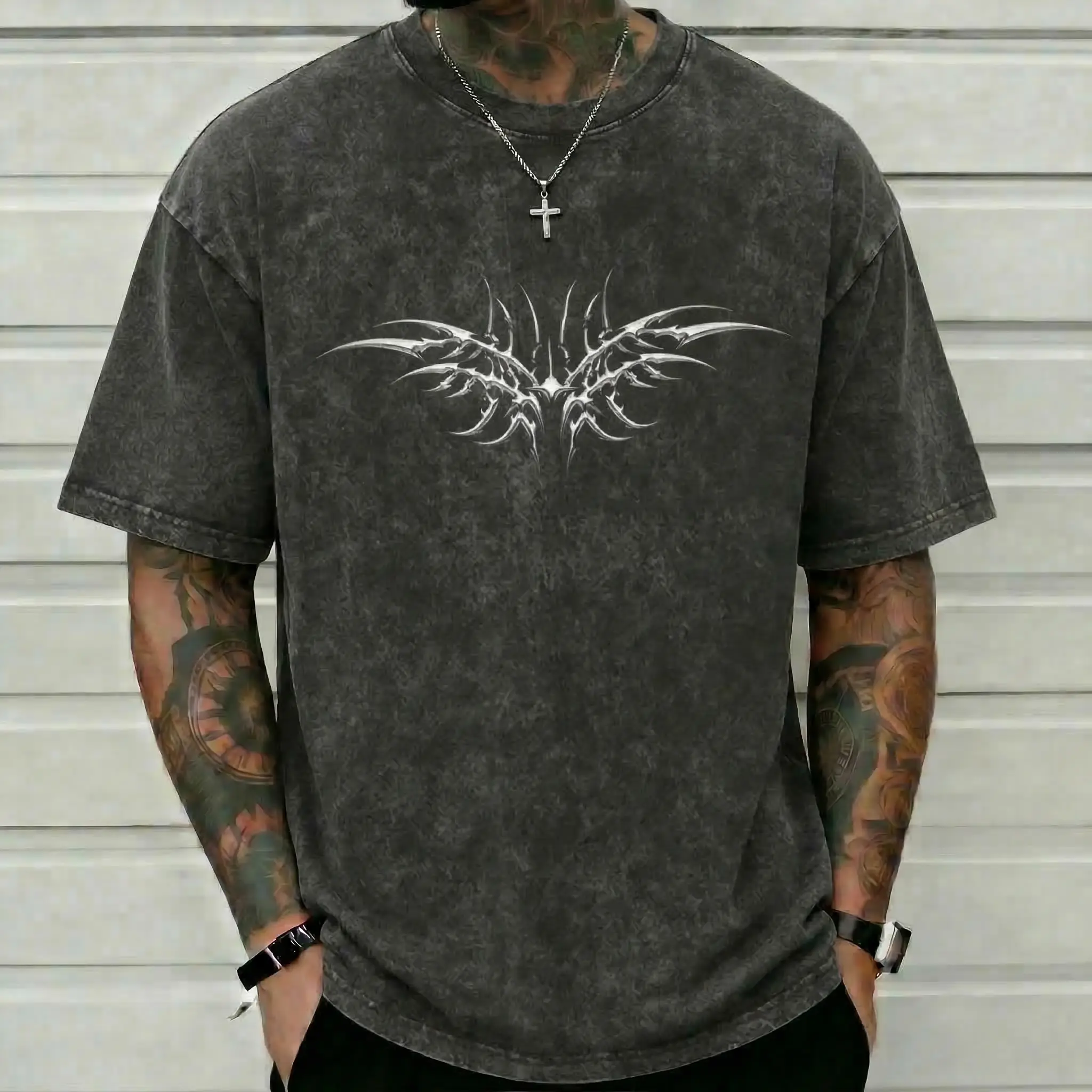 [Printed Design – Not Textured]Y2K Cyber Sigilism Graphic T-Shirt Acid Wash Vintage Grey Cotton Tee Oversized Tribal Chrome Design Gothic Grunge Style Streetwear Heavyweight Top For Me