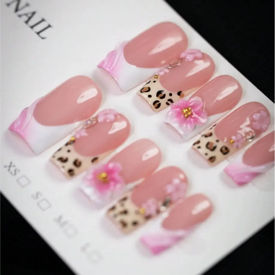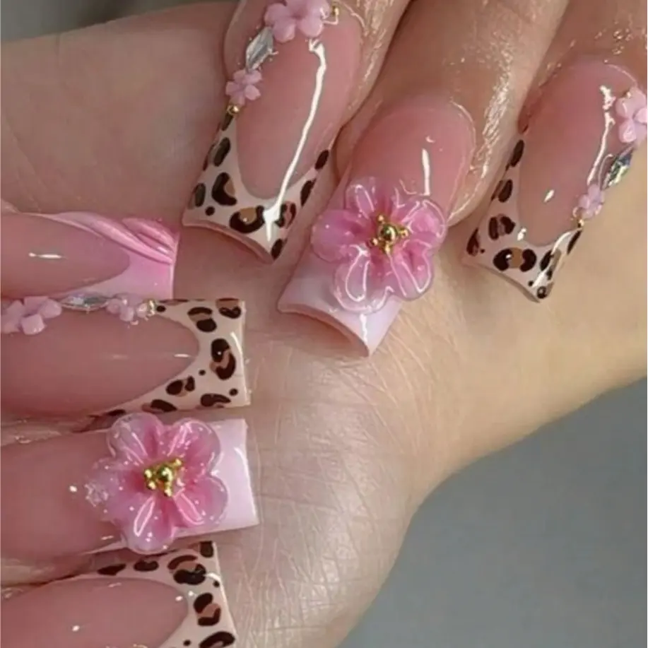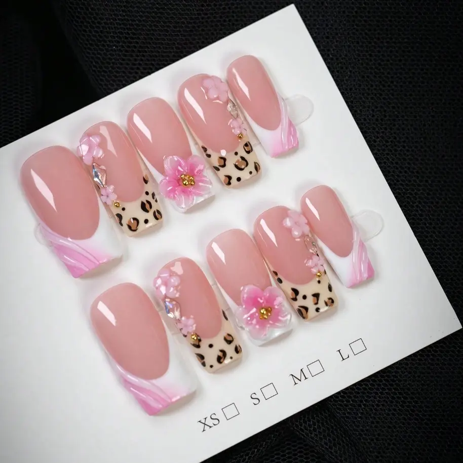10pcs Y2K Style Leopard Print Flower Press on Nails, Bead Square Nails, Salon Quality, Nude Gradient, Sparkling Diamonds #nailpolishswatch #daughtersnails #gelmanicureathome #acrylicpressonnails #nailpolishdaily #glamneticpressonnails #modernnails #valentinesnailsinspo #3dnailsdesign #nontoxicnails
