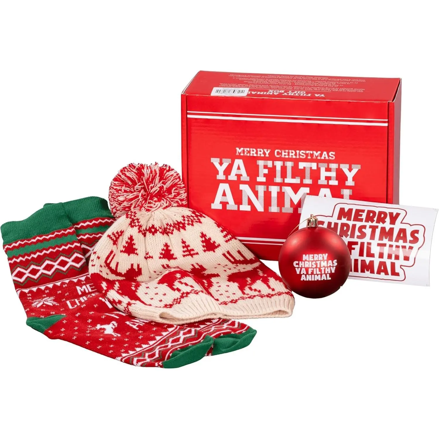 This festive bundle is packed with Christmas spirit, making it the perfect gift for friends, family, or even yourself. Inside, you’ll find a cozy holiday beanie hat to keep warm during winter festivities, one-size-fits-most socks for lounging in comfort, and a hilarious red “Ya Filthy Animal” ornament to highlight your Christmas tree.