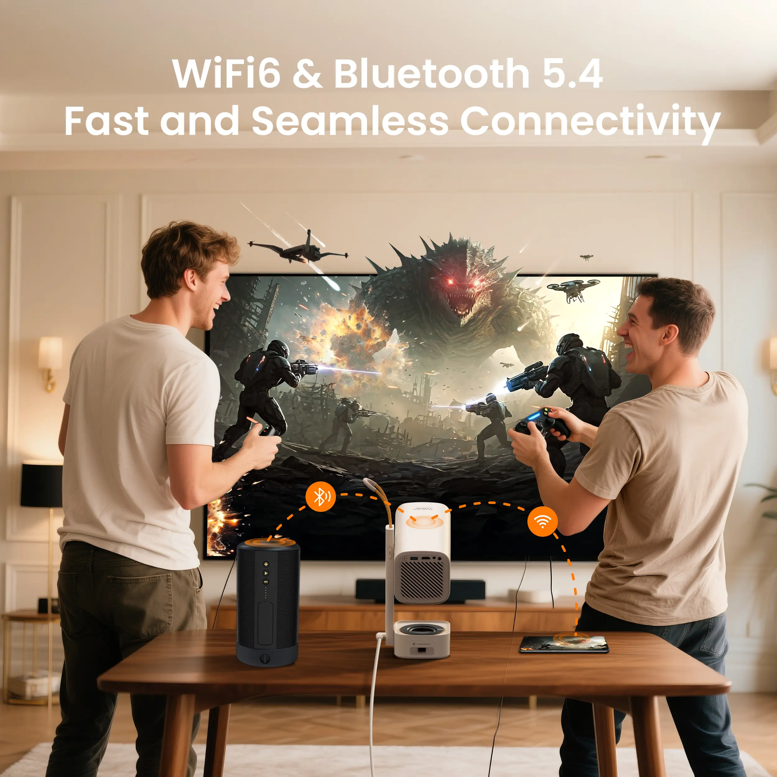 ·【Latest WiFi 6 Projector】Wi-Fi 6 is compatible with 2.4GHz and 5GHz networks, with the maximum rate up to 9.6G bps.Compared with the 5G network,it has three times faster speed, larger capacity for data transfer, and lower latency, which means our 4k projector with WiFi and Bluetooth can provide more stable and smoother transmission between devices and projector when used with a WiFi 6 router.Say goodbye to the lag and hello to uninterrupted wireless projection.