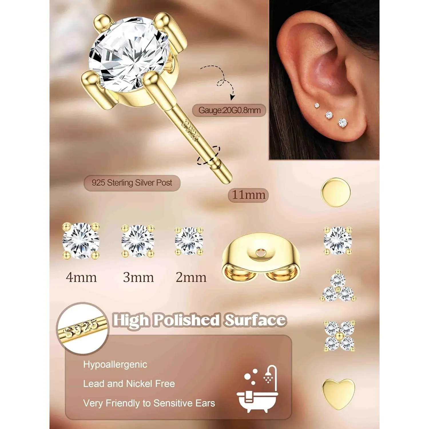 ·【Precise Sizes for a Perfect Fit】 Each pair of our sterling silver stud earrings is designed for comfort and style: Gauge: 20G (0.8mm), Post Length: 10mm. Choose from a variety of sizes: heart earrings (3/4/5mm), cubic zirconia earrings studs (2/3/4mm), dot earrings (2/3/4mm), three petals flower earrings(2.5/3/3.5mm), four petals flower earrings:(2.5/3/3.5mm). These small stud earrings for women are designed to fit perfectly and complement any outfit.