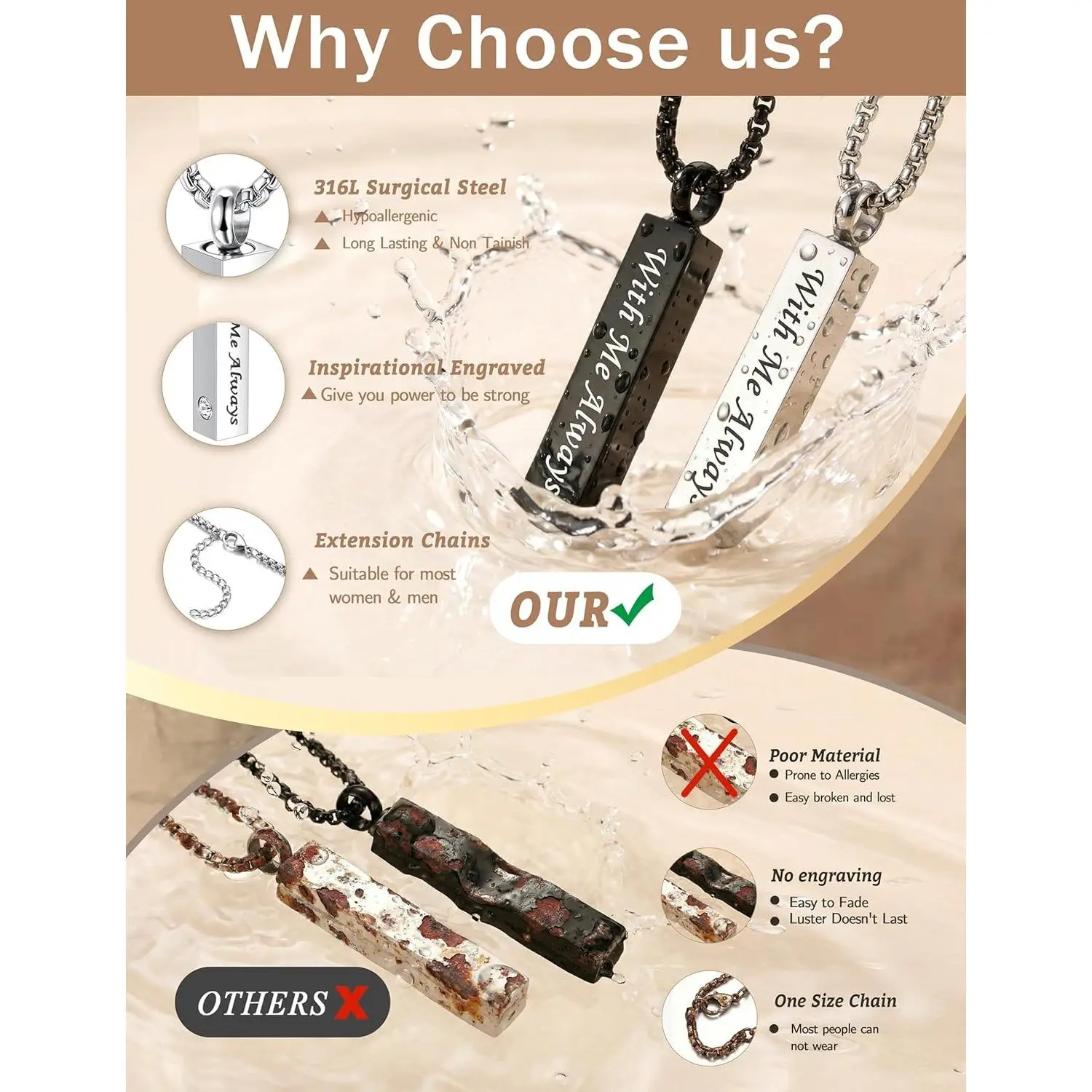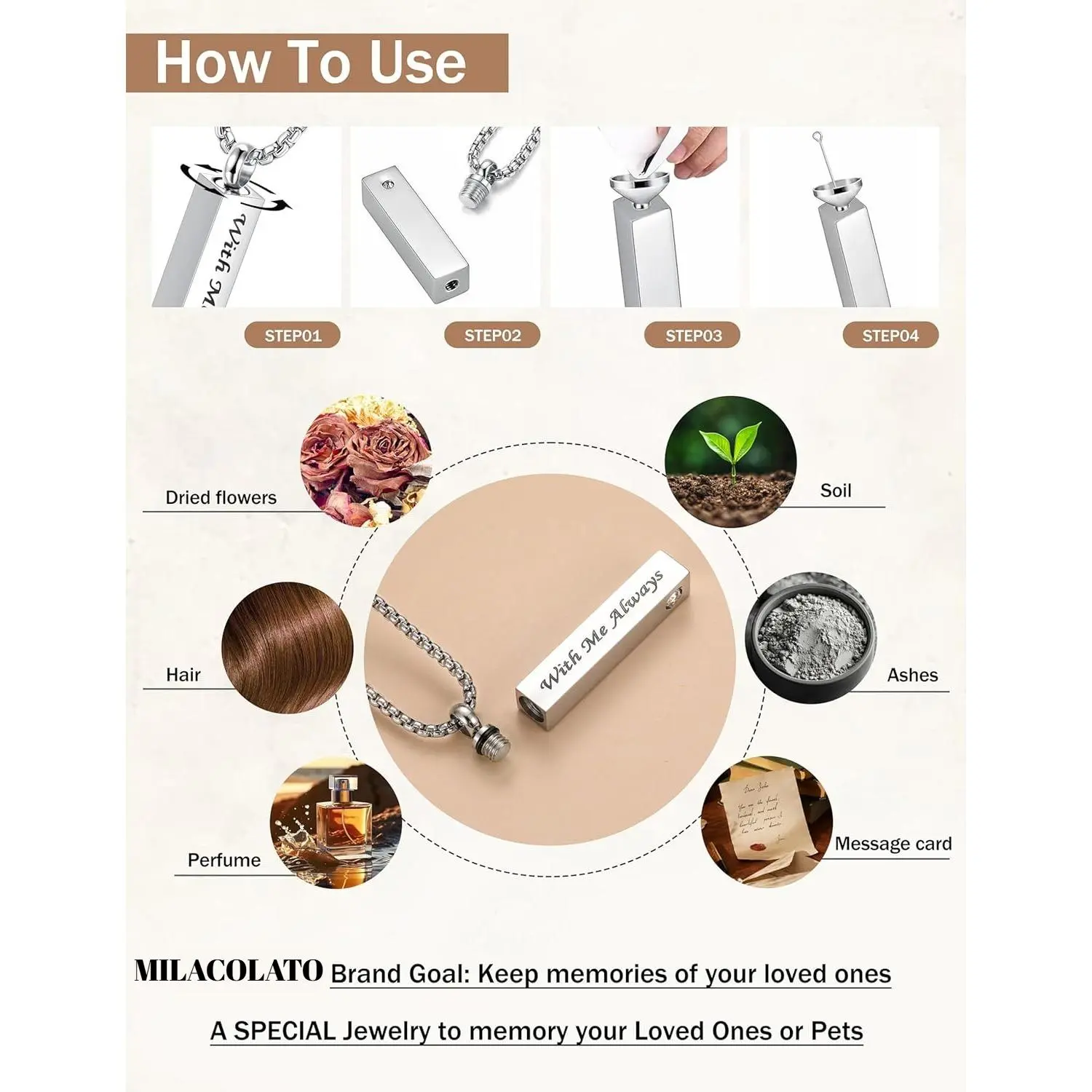 ·【MEMORIAL ASHES NECKLACE】Going through parting is painful, but it takes courage to always remember the lost. Keep your loved ones close to your heart with MILACOLATO urn necklace, the words uplifting printed on it can definitely remind and encourage you to live a strong life