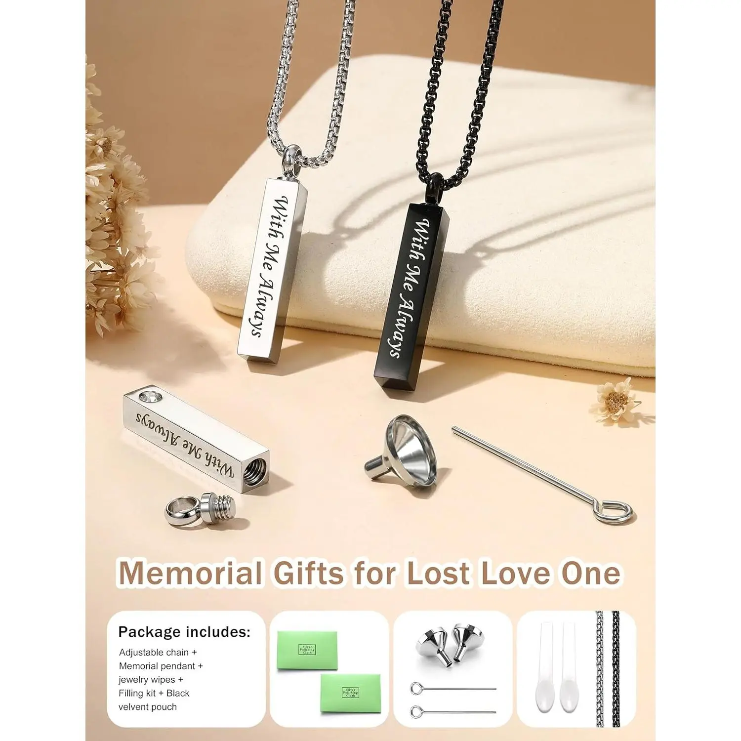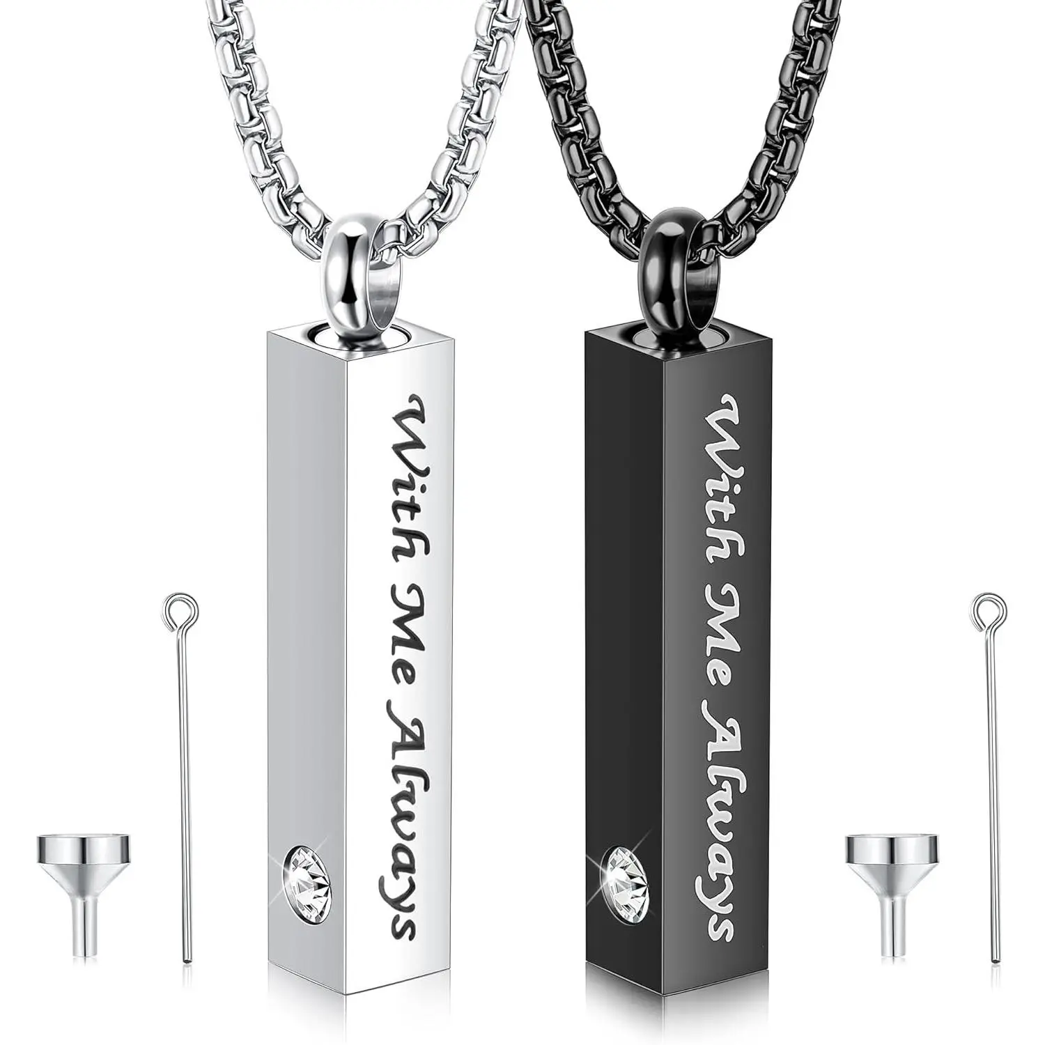 ·【HIGH QUALITY JEWELRY SET】Each urn necklace comes with 2 necklaces, a stainless steel pin, funnel and silver polishing cloth. High quality 316L stainless steel set with AAA+ Cubic Zirconia, lead free, nickel free, hypoallergenic. Highly polished smooth surface that will never fade, tarnish, rust, easy to clean and long service life. Upgraded screws and airtight safety washers keep contents dry and won't open when worn