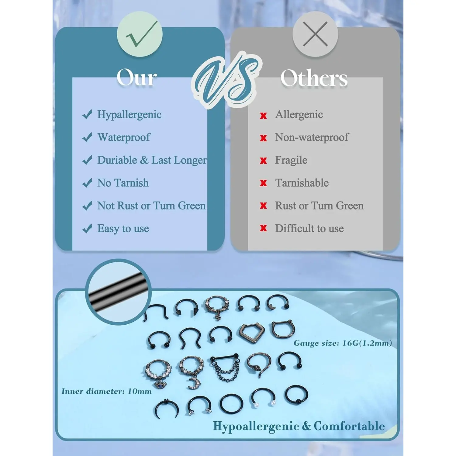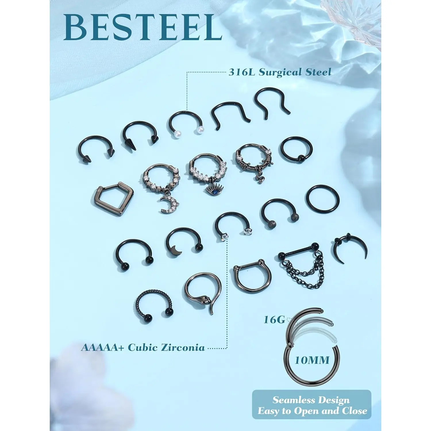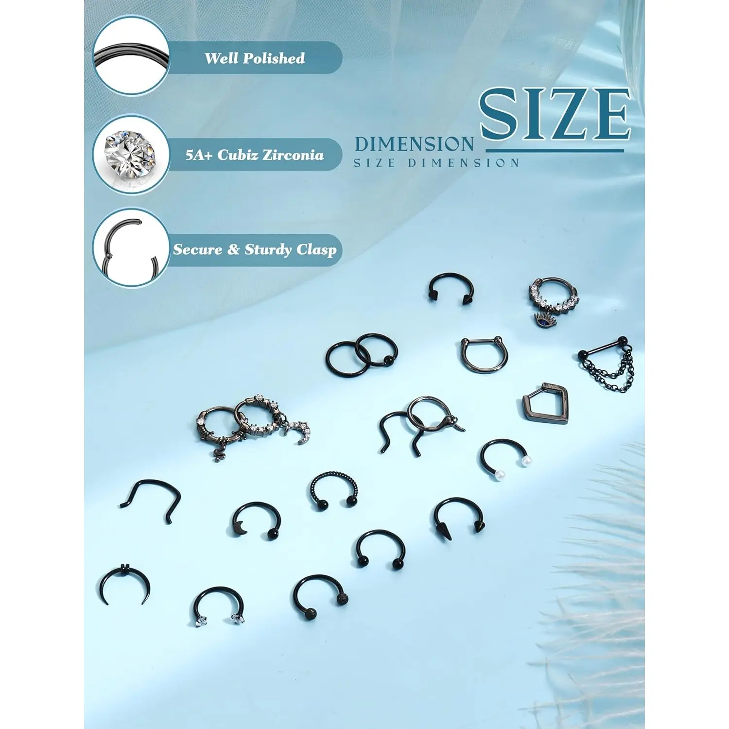 ·Hypoallergenic Surgical Steel Septum Jewelry: Crafted from 316L stainless steel, these septum nose rings feature CZ for a subtle sparkle. The 16G septum ring designs are polished to a smooth finish for comfortable wear