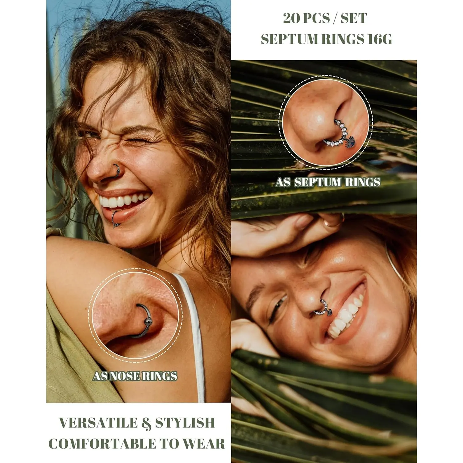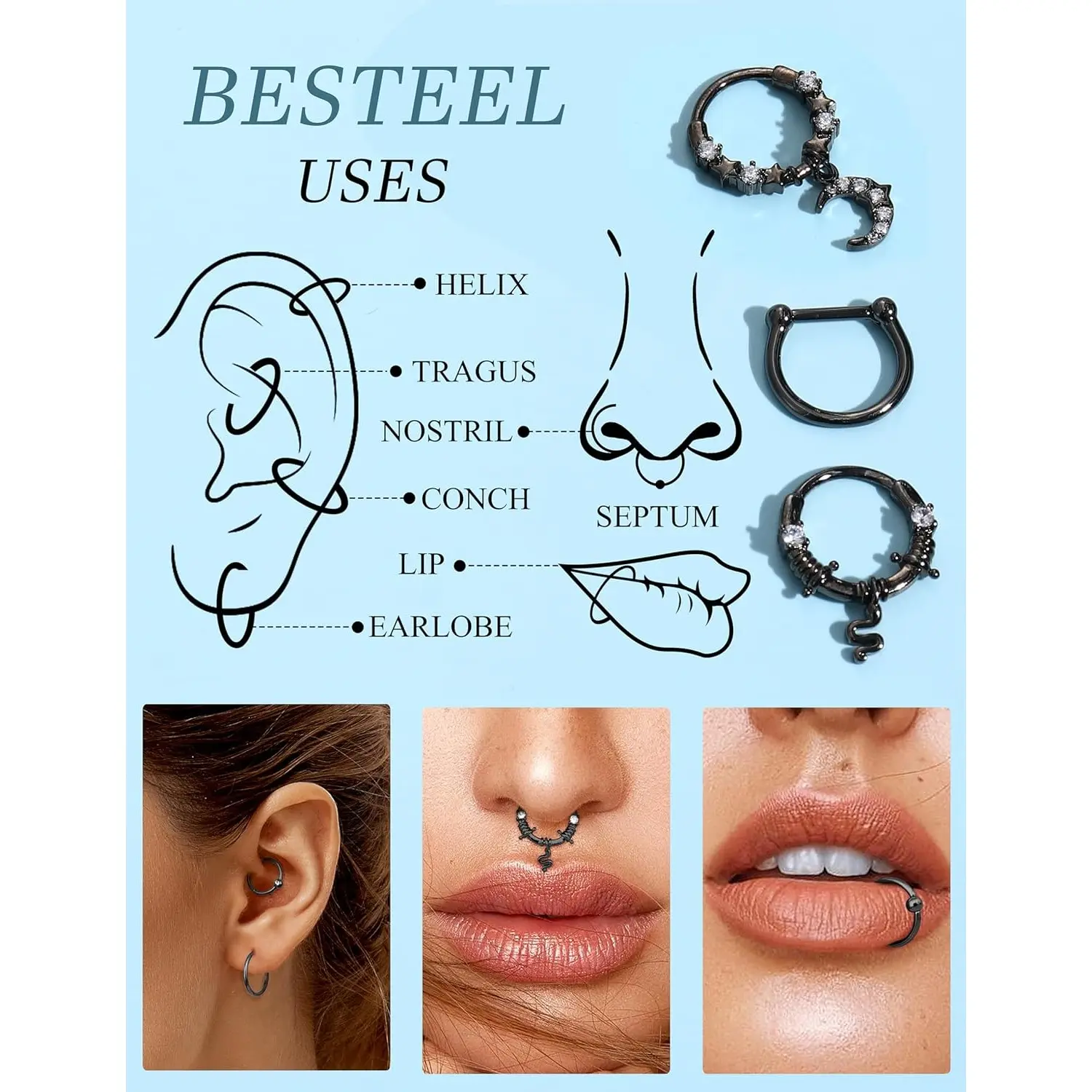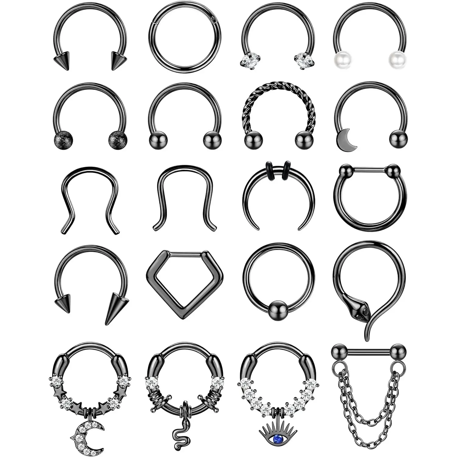 ·Trendy Designs: From minimalist to bold, choose from septum piercing jewelry styles like hinged clickers, and dainty hoops. Whether you prefer a black septum ring for everyday wear