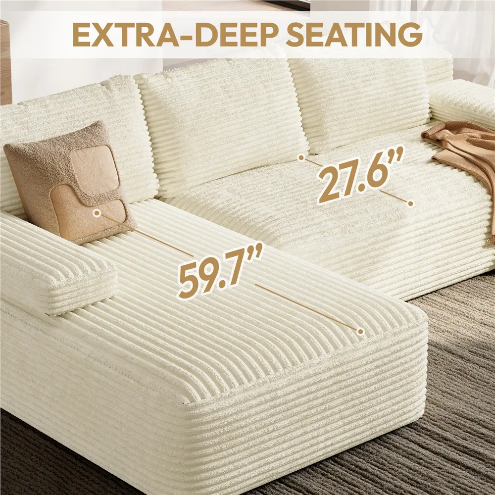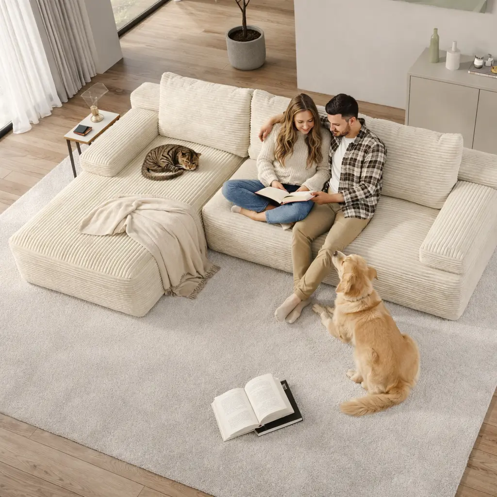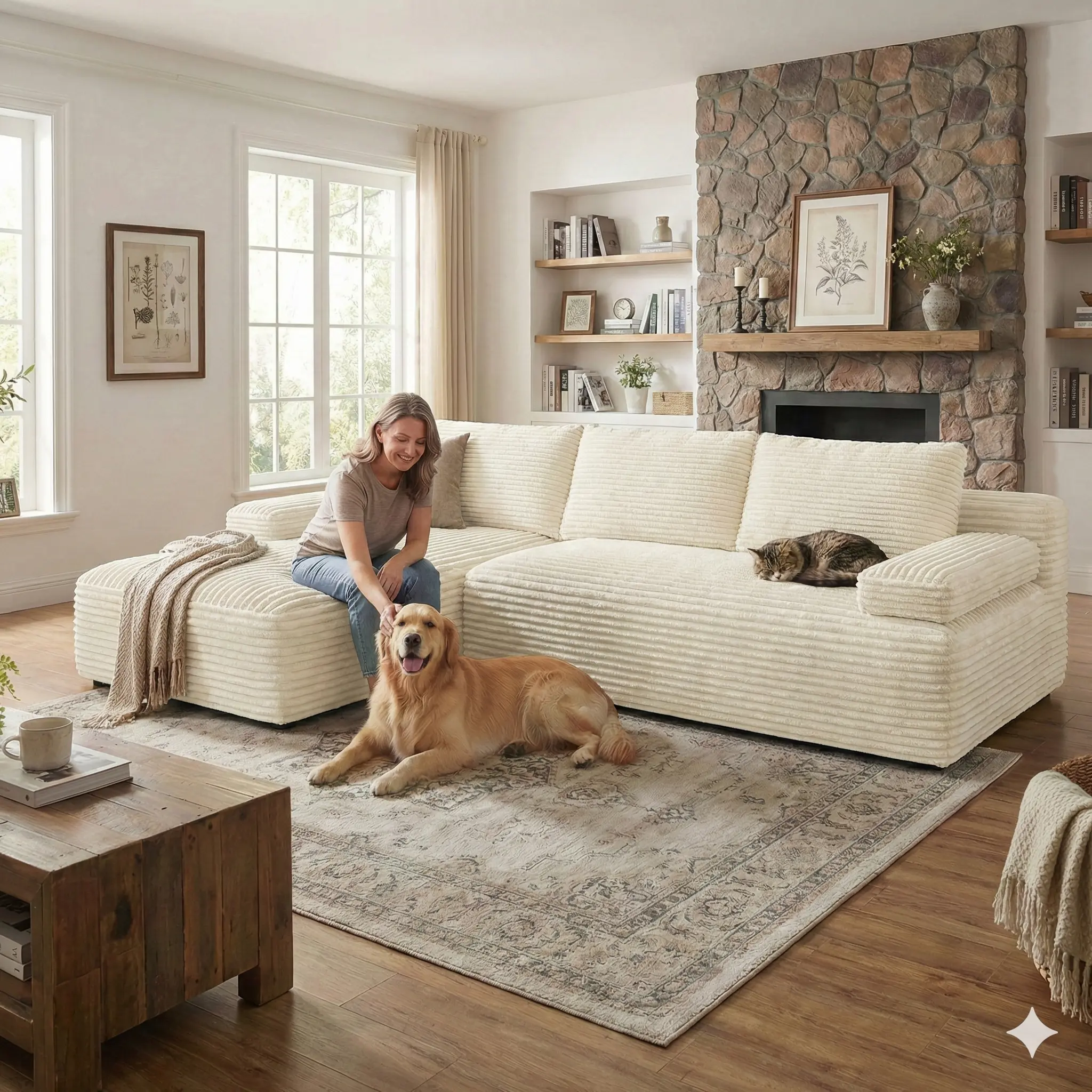 This modular sectional sofa brings cloud-like comfort and an easy, casual elegance to your living space. Designed with deep seating, rounded edges, and soft corduroy upholstery, it creates a cozy retreat for movie nights, afternoon naps, or relaxed gatherings with family and pets. A chaise and a sofa, three detachable pillows and bolsters, and two zip-on armrests let you rearrange the layout effortlessly, adapting the sofa to small get-togethers or long lounging sessions. Supportive foam cushions, sturdy construction, and a wide seating area make it ideal for everyday living, whether you’re furnishing a first apartment or refreshing your home décor. With removable pillow covers, pet-friendly fabric, and a no-assembly, ready-to-use design, this sectional couch blends comfort, flexibility, and style—an inviting centerpiece for any modern living room.
