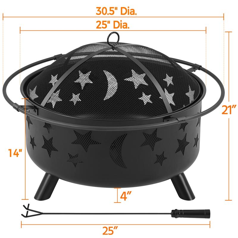 6.【Spark Screen & Poker Ensure Improved Safety】The spark screen shields against flying sparks and stray embers, while the 20″ long fire poker helps tend the firewood inside the fire bowl and lift the spark screen from a safe distance