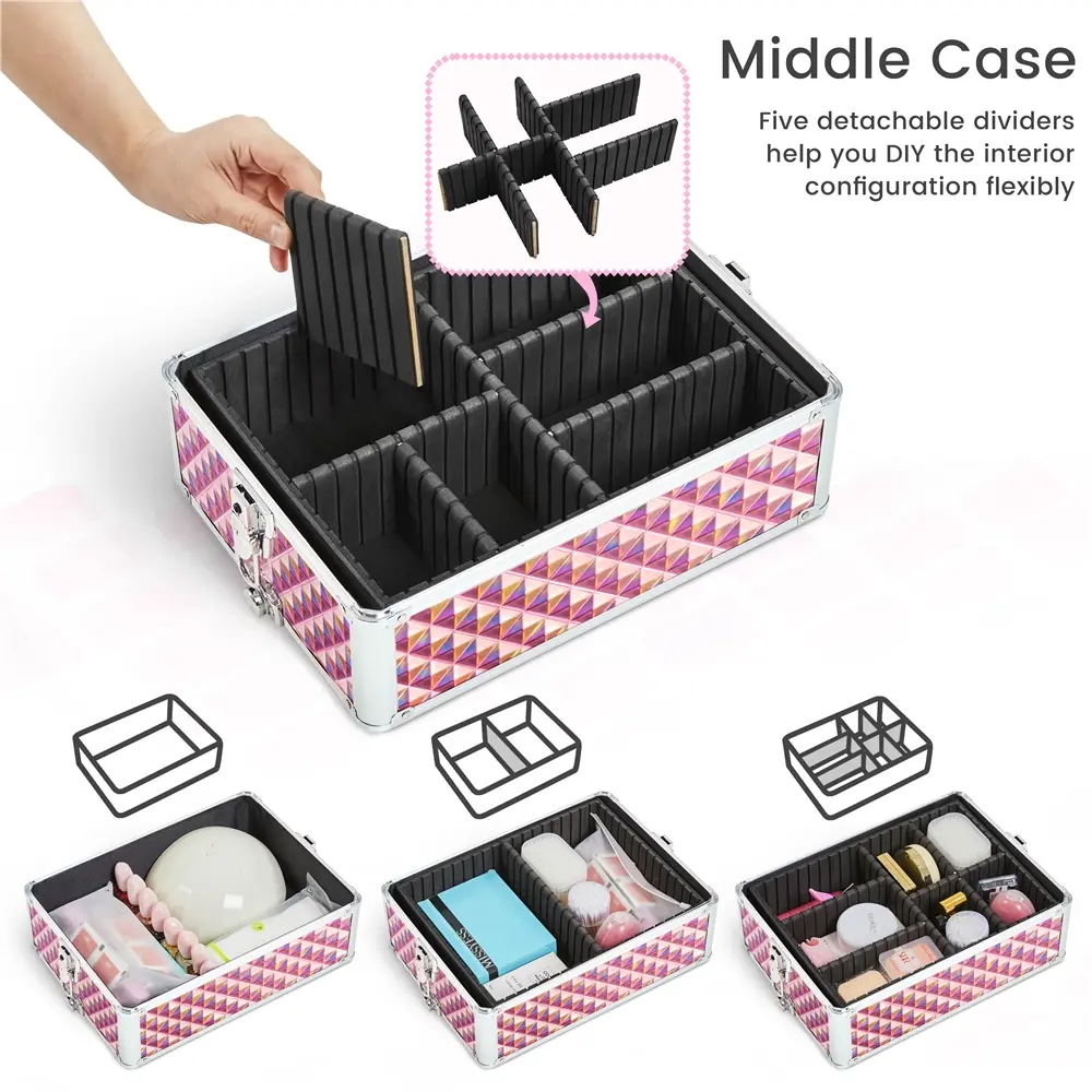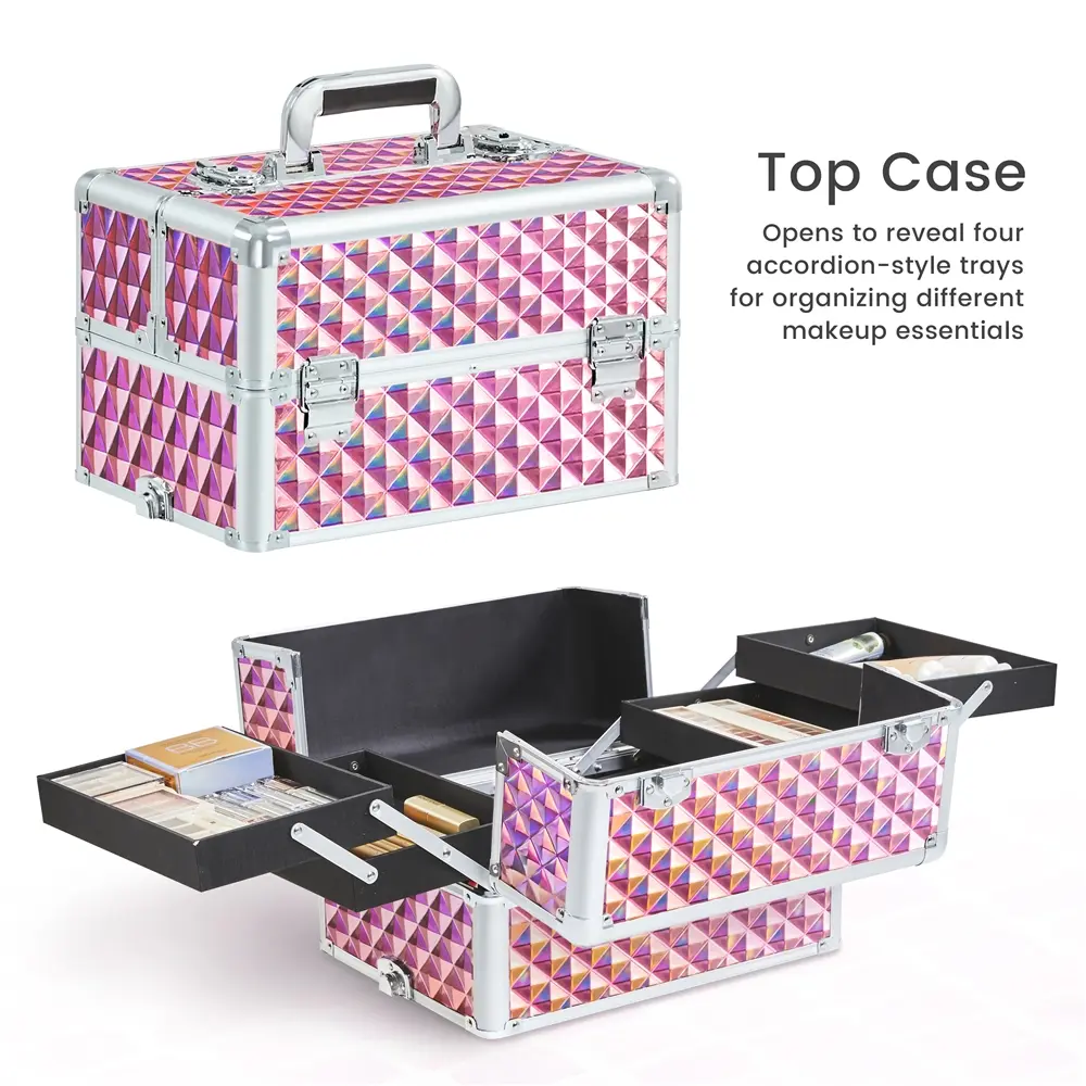 A must-have for makeup & beauty enthusiasts! Carefully crafted with strong manufactured wood and a waterproof plastic surface, this stylish makeup train case features a sturdy aluminum alloy frame and reinforced steel corners to ensure exceptional durability.