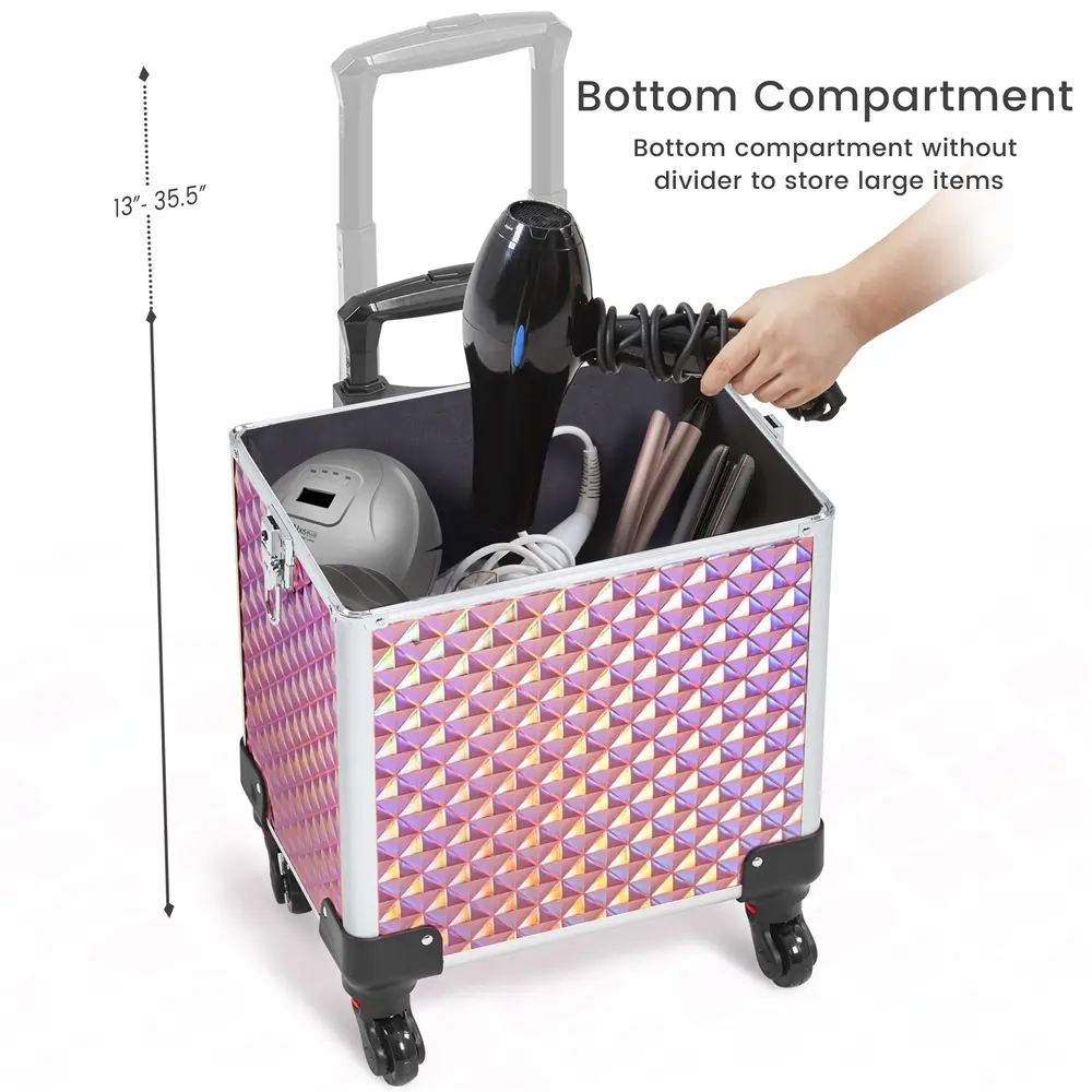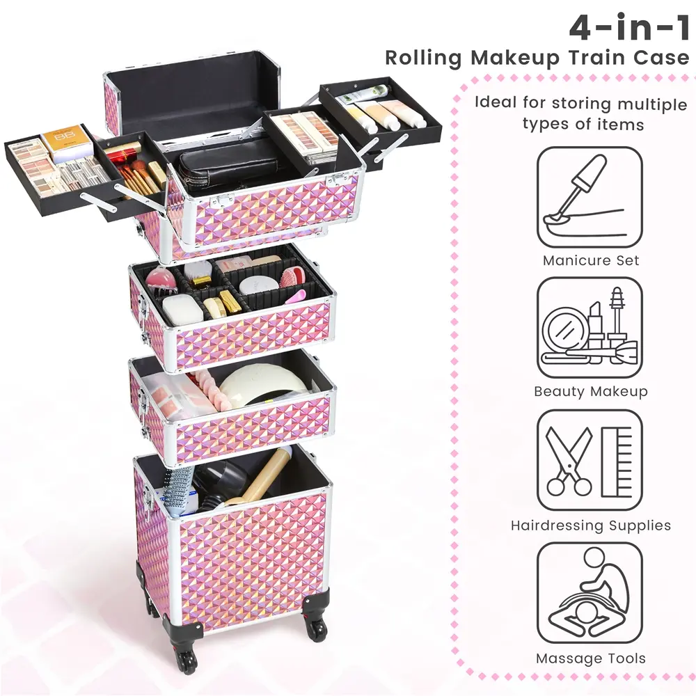 With its large capacity and 4-tiered layout, this cosmetic train case is the ideal solution for storing, organizing, and transporting all your cosmetics, manicure, and hair products. Plus, the 360-degree rubber wheels give you a smooth, quiet, and effortless journey from one place to another.