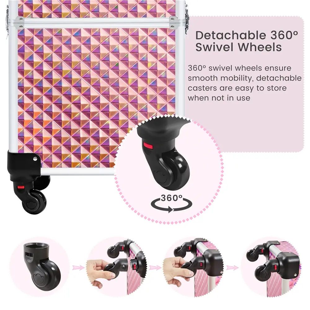4.【Effortless 360-degree Rolling】This rolling makeup case with 360-degree rubber wheels can safely and effortlessly transport your beauty products wherever you go. Its pull handle with hexagon telescopic rods can be securely attached to the case using a strap, ensuring added stability during travel.