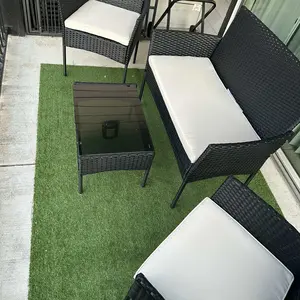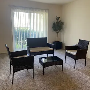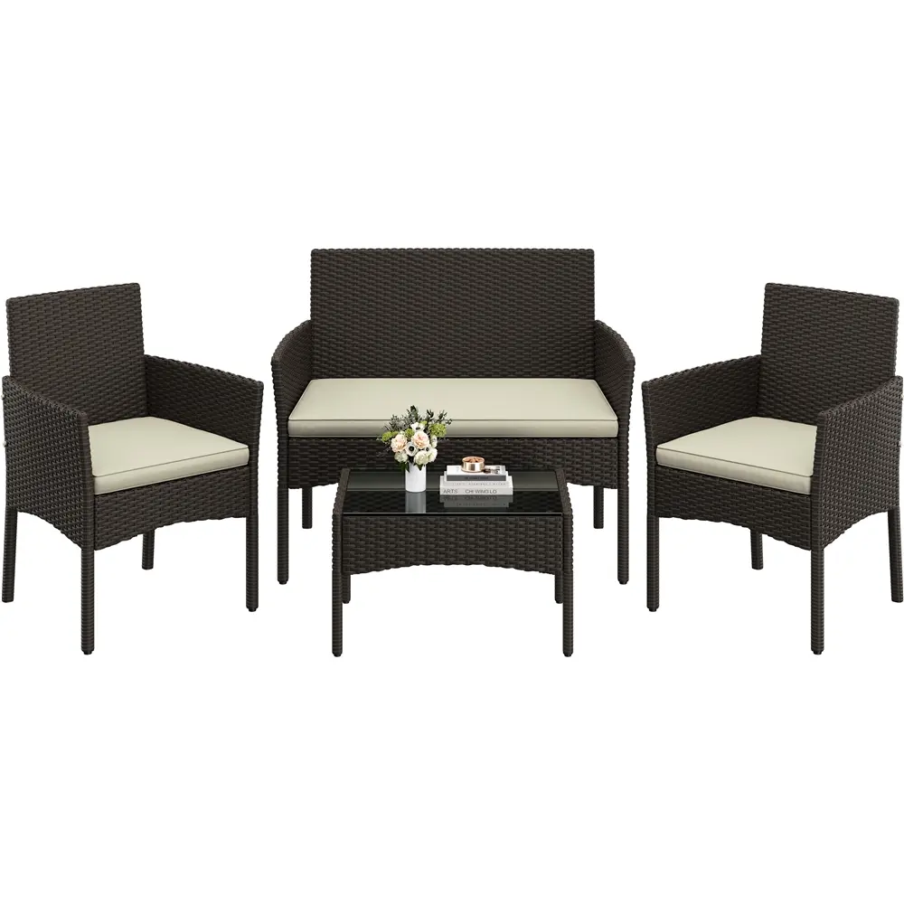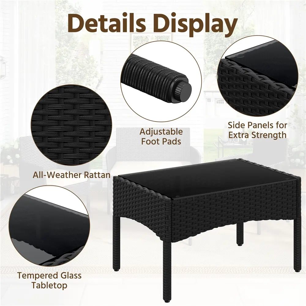 Transform your outdoor space into a cozy retreat with this 4-piece garden sofa and table set. The loveseat, two single sofas, and coffee table are crafted from durable, hand-woven PE rattan, blending strength with a natural, inviting look. The thick foam cushions and ergonomic backs provide all the comfort you need, while the tempered glass tabletop adds a sleek touch. Thoughtful details like suction cup fixing and rounded edges offer safety, and adjustable foot pads make sure the set stays steady on uneven ground. This set is made for relaxed moments or lively outdoor chats, bringing both style and practicality to your space.