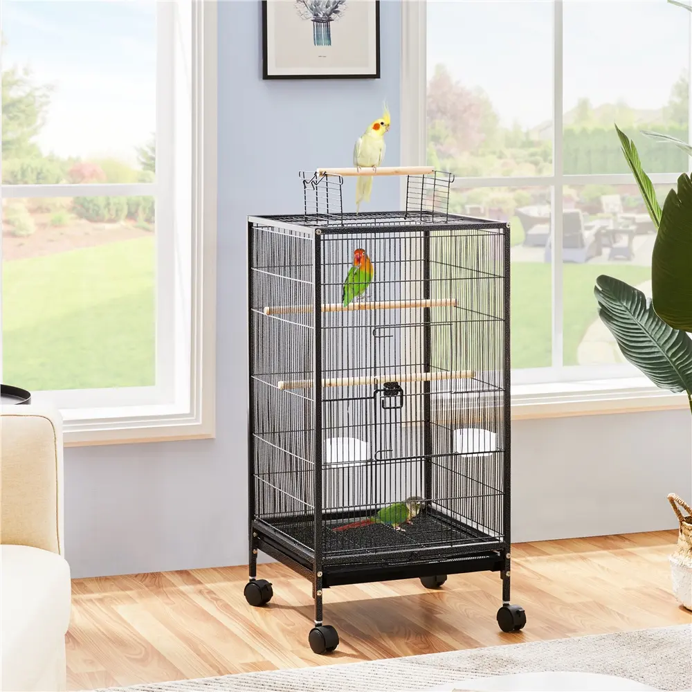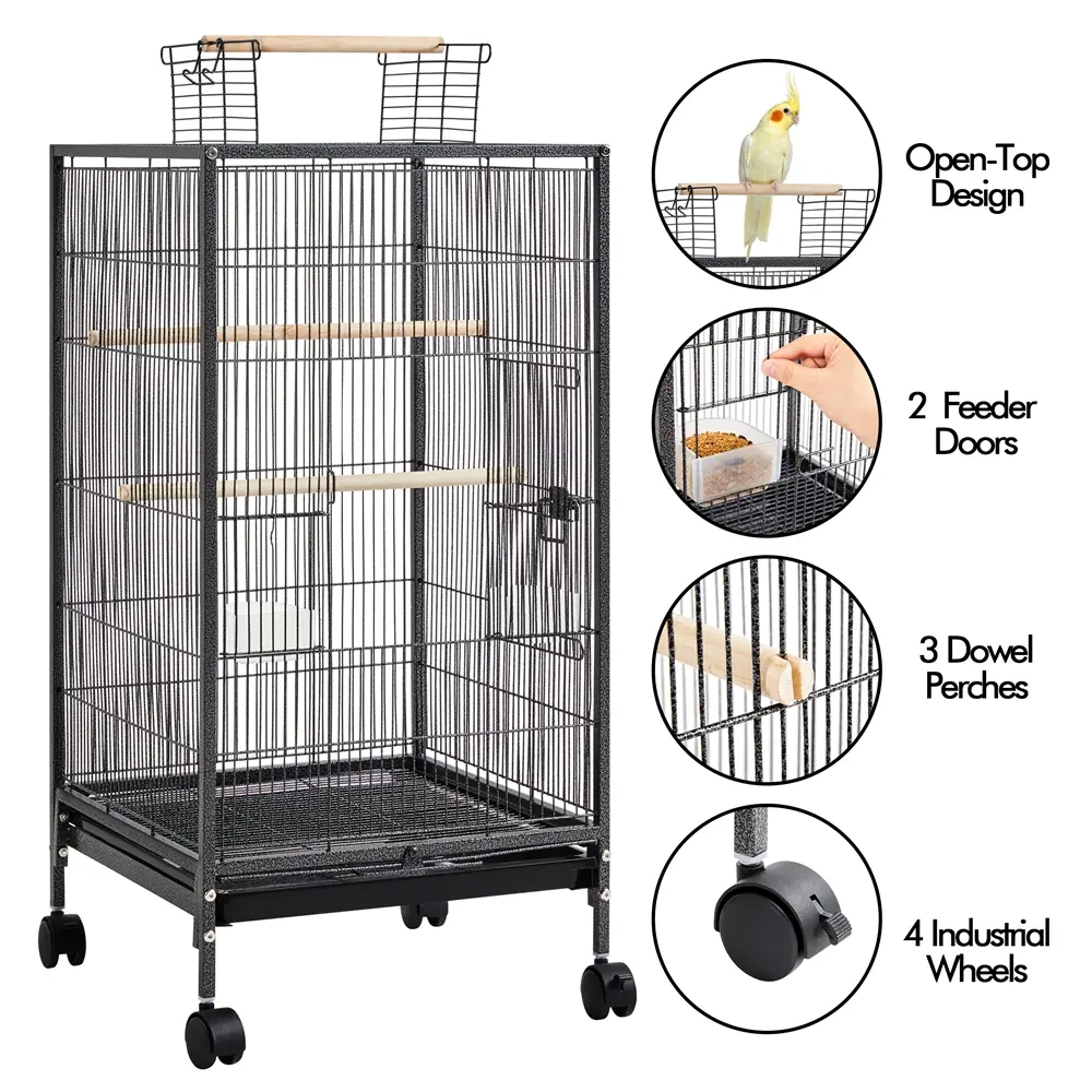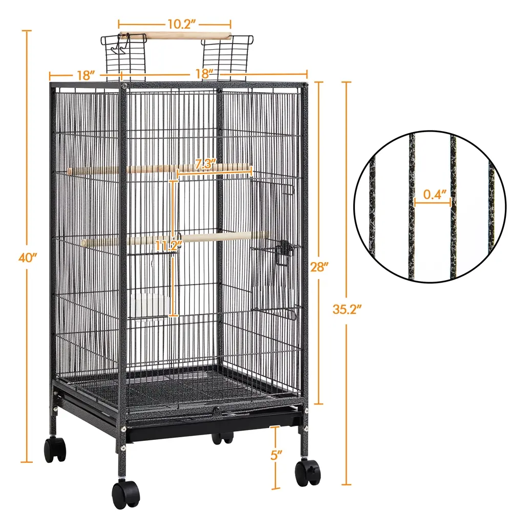 For new bird parents with 1-2 small-sized birds, this solid metal open-top bird cage on wheels is a good starter. Constructed of solid steel with an oxidant-resistant finish, this substantial bird cage boasts high strength, good durability and safety. With a cage size of 18″ L x 18″ W x 28″ H and a bar spacing of 3/8″, this rolling bird cage will give your petite feathered friends plenty of room to roam about and stretch their wings. Specially designed for small-sized birds like budgies, canaries, cockatiels, finches and parakeets. The convenient features like open-top design, 360-degree wheels, feeder doors, and slide-out tray make everything easier for first-time bird owners. Besides, this metal bird cage comes with two feeders and three dowel perches for your convenience. Simple assembly is required.
