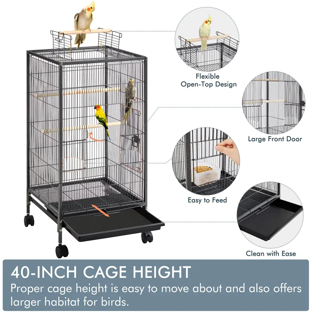 6. Hassle-Free Maneuverability: Thanks to the four 360-degree wheels (two with locks), you can move this open-top bird cage freely around the house to clean or to give your birds a sunbath and lock it in place when needed. The cage can be used with or without wheels