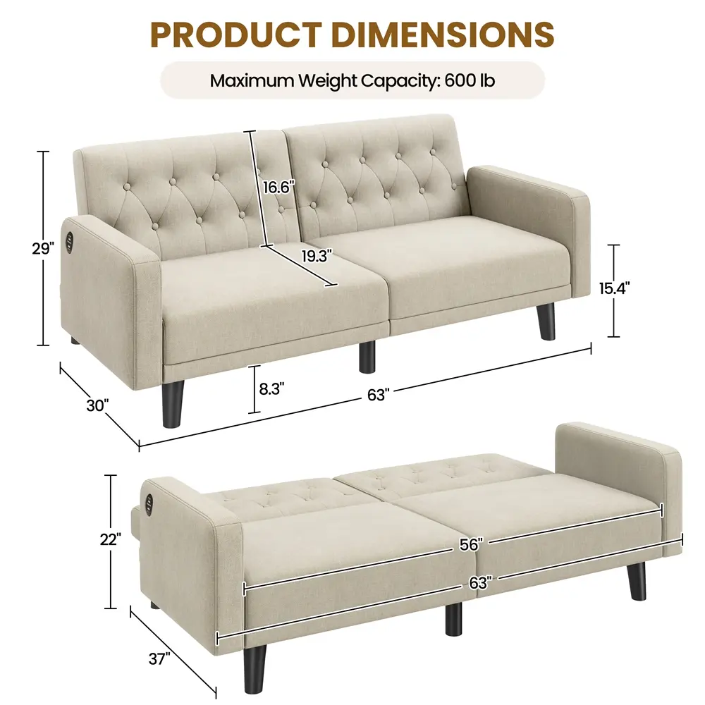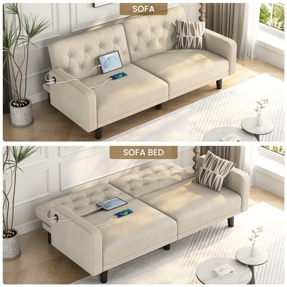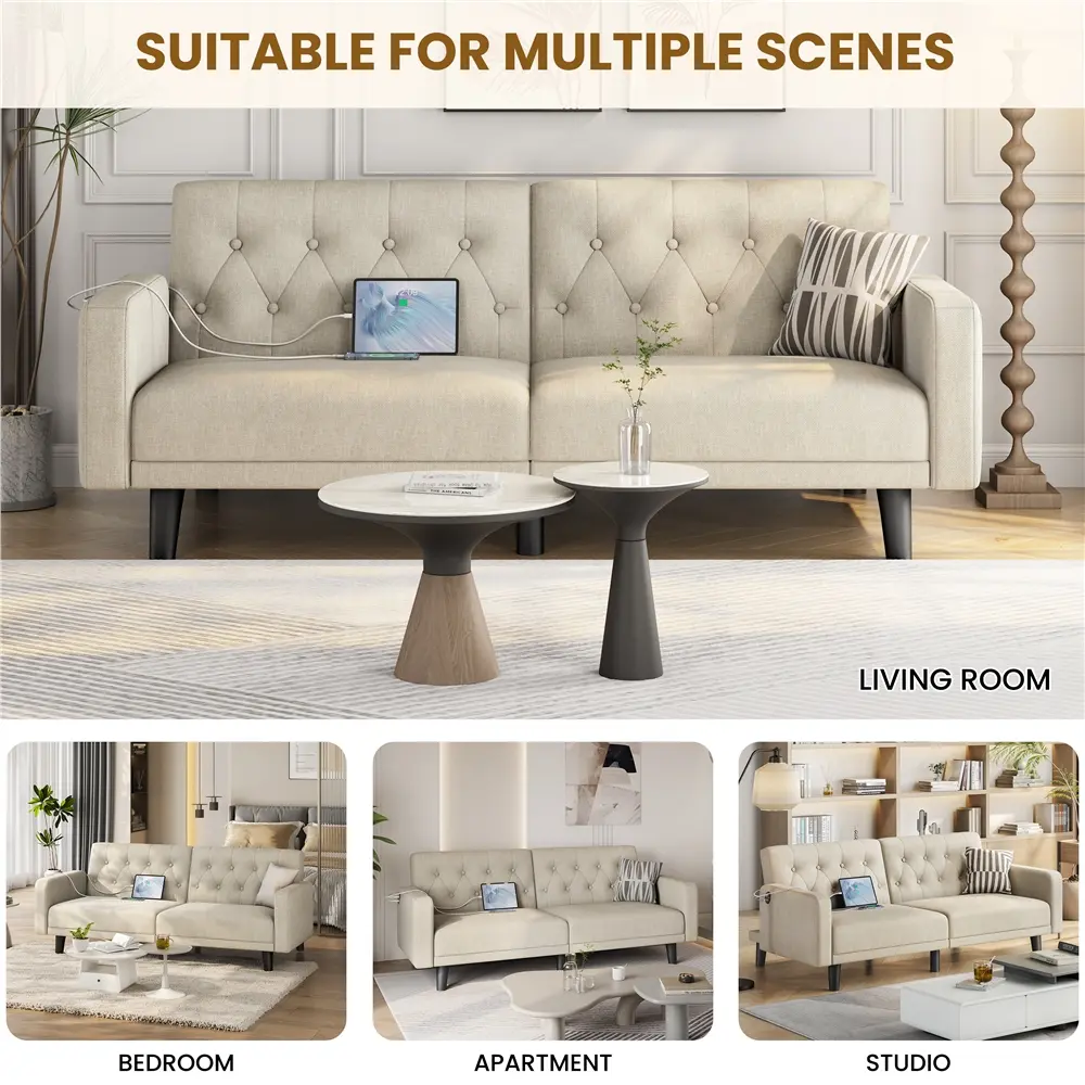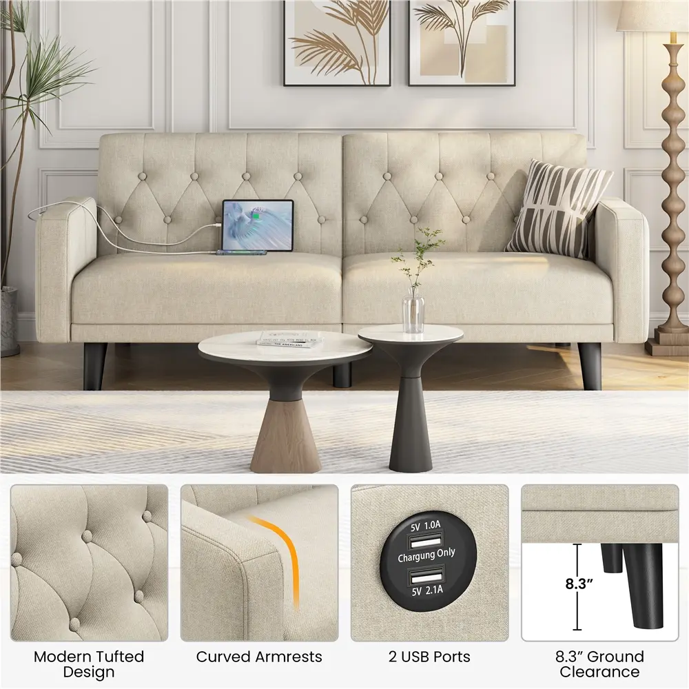 This versatile convertible futon sofa bed offers a blend of comfort and functionality. Built with a sturdy manufactured wood frame, breathable fabric, and thick cushioning, it ensures stability and a cozy seating experience. The sinuous springs and plush foam provide full body support, while the three adjustable angles allow you to switch between sitting, lounging, or even lying flat for sleep. Its contemporary tufted design adds a stylish touch to any room. Equipped with two USB ports for easy device charging and enough ground clearance for easy cleaning, this multi-functional sofa is ideal for compact spaces, offices, and guest rooms. Enjoy comfort and convenience in one!