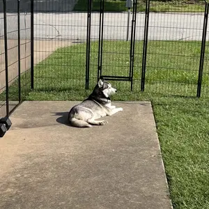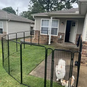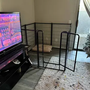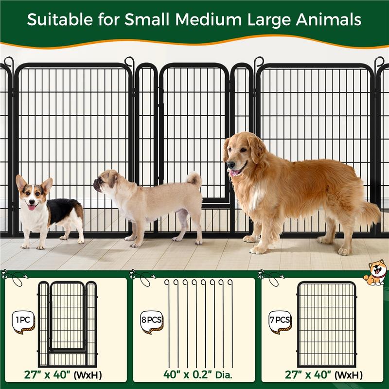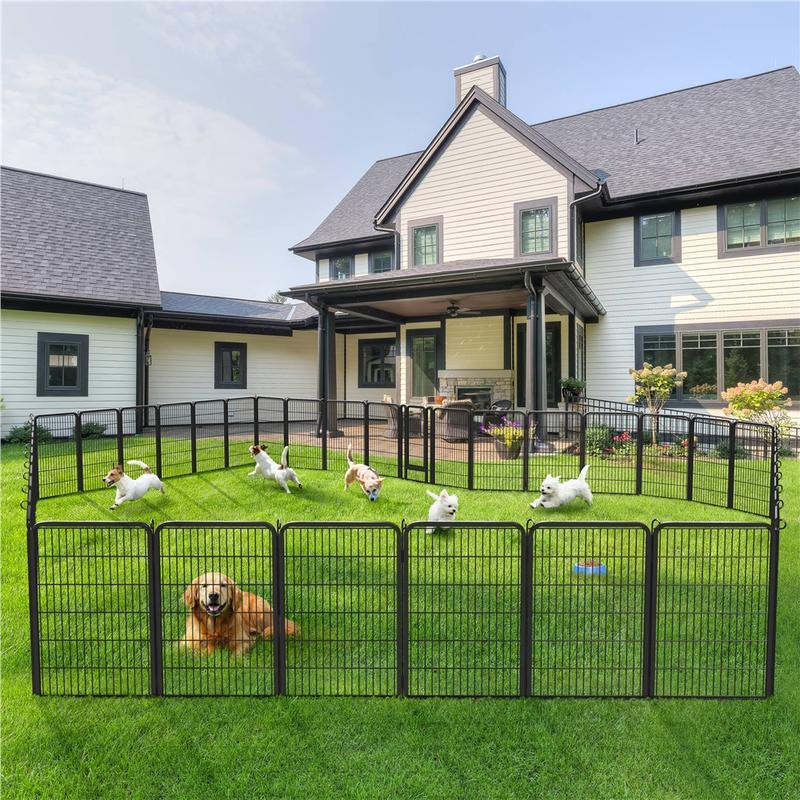 Our pet playpen boasts a premium-quality, black-finished steel construction that ensures longevity. Ideal for pets, this fence creates a secure, enclosed area with an open top for play and exercise. Use it to limit your pet's space or to keep them away from other animals. This heavy-duty playpen is suitable for dogs, ducks, rabbits, and more. It's simple to set up without requiring any tools and can be utilized indoors, during RV camping or traveling, or for other yard activities. Metal stakes connect the panels, making it easy to construct various shapes by adding or removing panels.
