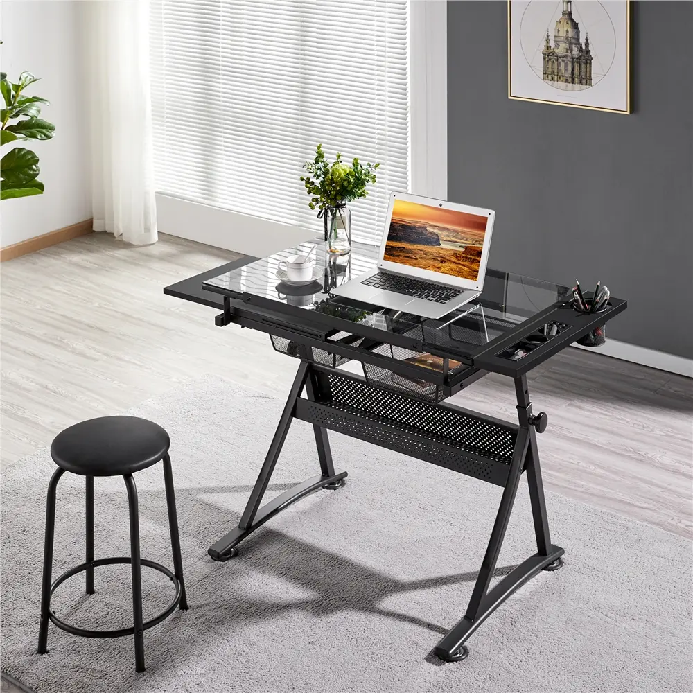 This practical drafting table can serve flawlessly as a writing/reading table, computer table and workstation and can also be easily transformed into an easel for painting, drafting, sketching. It is effortless to adjust the angle of the desktop with maximum adjustment to 60°, and lock it in the desired position with the click-clack adjustment mechanism. Under the desktop, arrange a 30.7″ L × 9.3″ W storage shelf with an anti-dropping back barrier to keep your tools, picture books, or any items temporarily out of use. The support frame of this drawing desk is reasonably designed into a double-X shaped construction with reinforcing bars connecting the tubes into an integrated structure.
