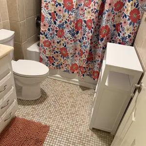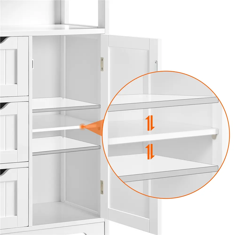 5. 【Good quality and safe to use】 Our freestanding floor cabinet is made of premium P2 MDF and metal accessories. The surface is polished well smoothly, and it is easy to clean. Wipe it clean with a wet cloth. In addition, for safety, the bathroom storage shelf has an anti-toppling device behind it.