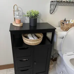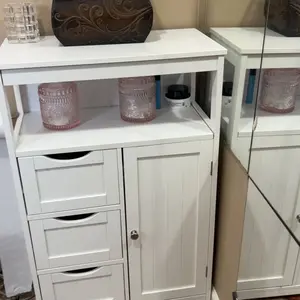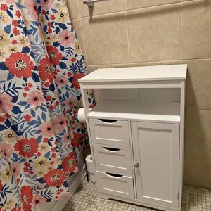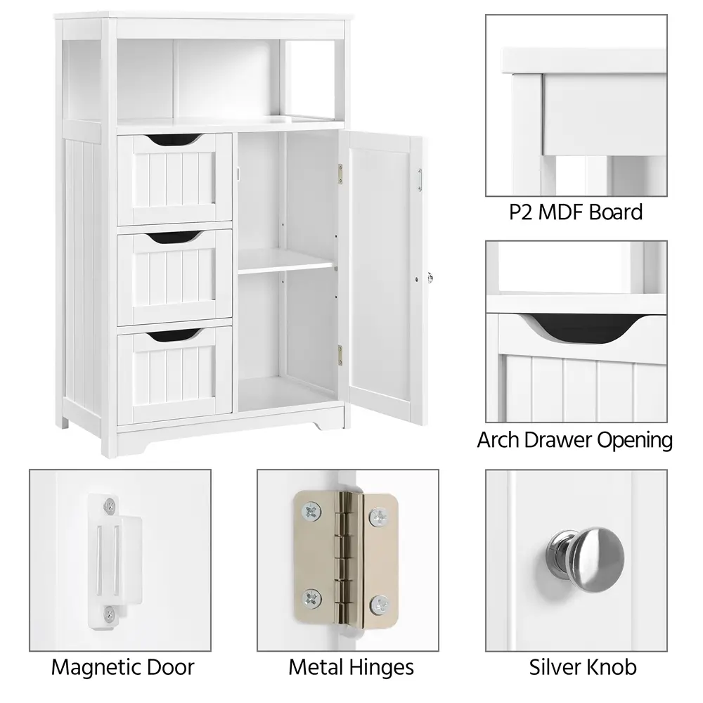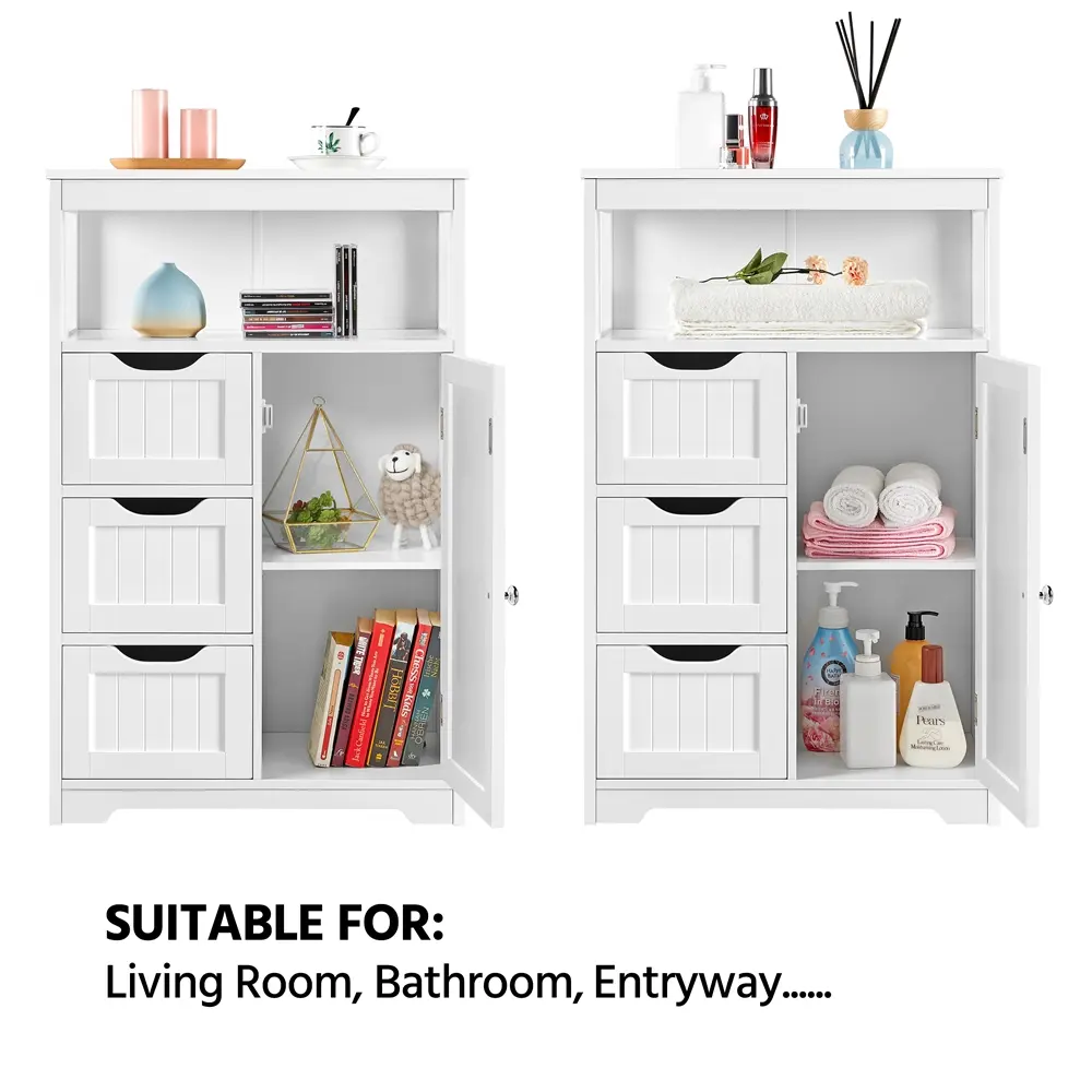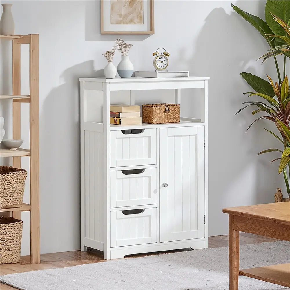 Worry about the mess at home? It's better to add a nice and practical cabinet that not only makes your items in good order but also brings fresh beauty to your home. This floor cabinet is made of durable MDF boards with metal accessories. The good quality of the cabinet makes sure a long-time service for you. The storage shelves feature multiple tiers for various storage needs, 1 tabletop, 1 open shelf, 3 drawers, and 1 small 2-tier cabinet. It is practical and good-looking, and you can put this freestanding cabinet in your bedroom, living room, bathroom, kitchen, anywhere you want to put. Do not miss it!