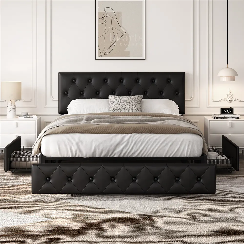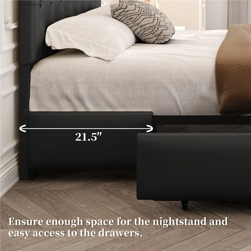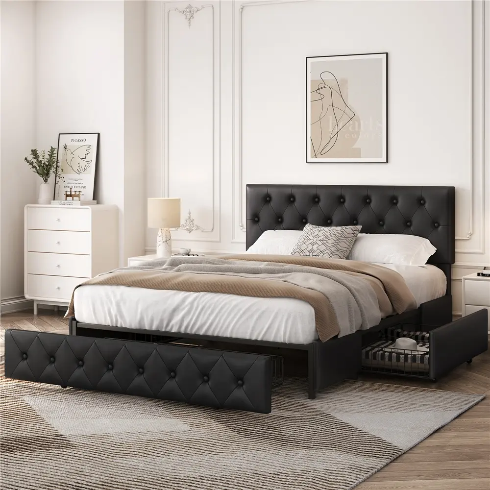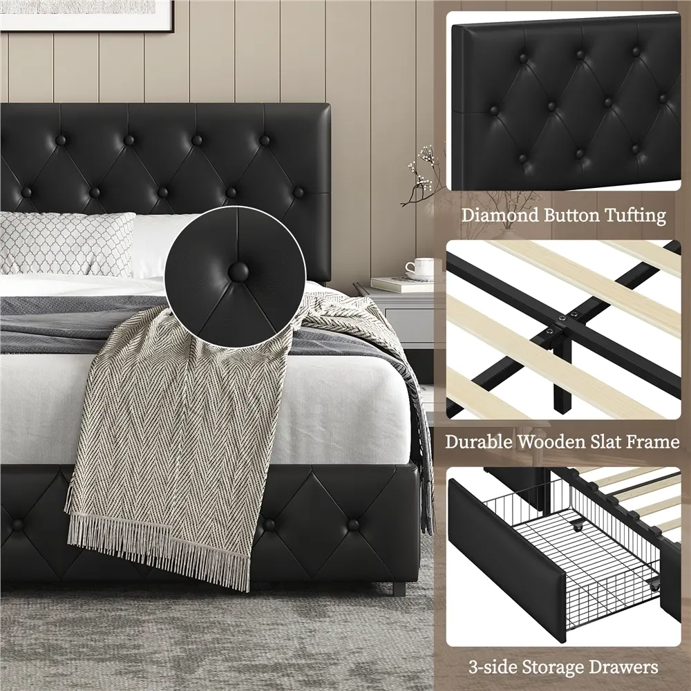 Crafted in a modern style with sleek lines and graceful button-tufted diamond patterns, the bed frame exactly interprets elegance and sophistication, ideal for contemporary and traditional room styles. The bed frame is made with sturdy wood that includes a strong wooden slat system as well as solid metal rails on the headboard and in the center, ensuring a long life span. The headboard height is adjustable to suit different sizes of mattresses. With 3 pull-out wire netting drawers at the base of the bed, you are provided with convenient storage compartments to keep your bedroom essentials. Easy to pair with all sorts of different decor, you get to decide whether this bed blends in or stands out.